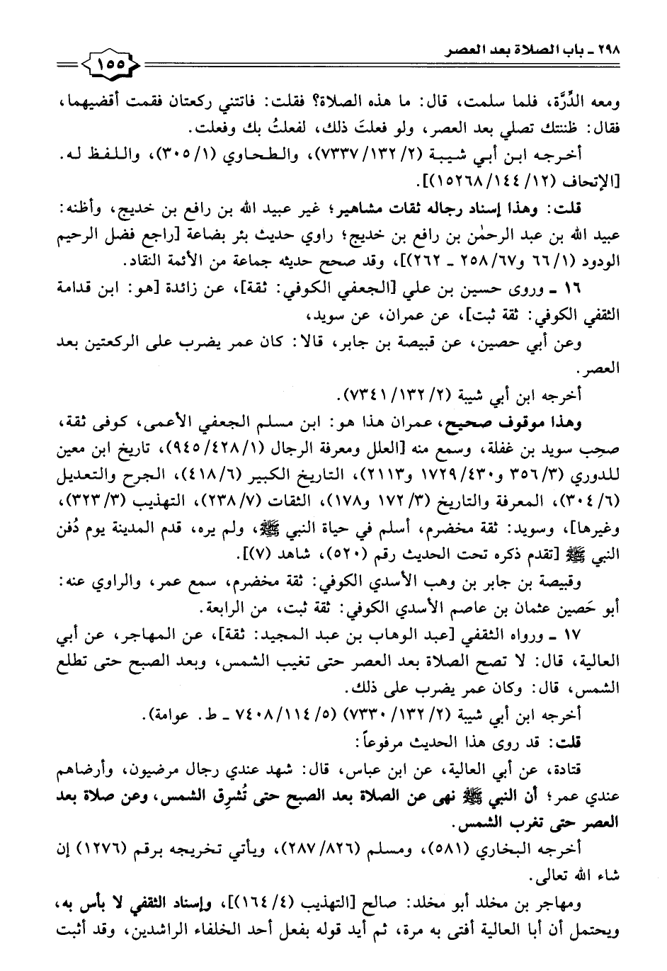 ١٧ - ورواه الثقفي [عبد الوهاب بن عبد المجيد: ثقة]، عن المهاجر، عن أبي العالية، قال: لا تصح الصلاة بعد العصر حتى تغيب الشمس، وبعد الصبح حتى تطلع الشمس، قال: وكان عمر يضرب على ذلك.