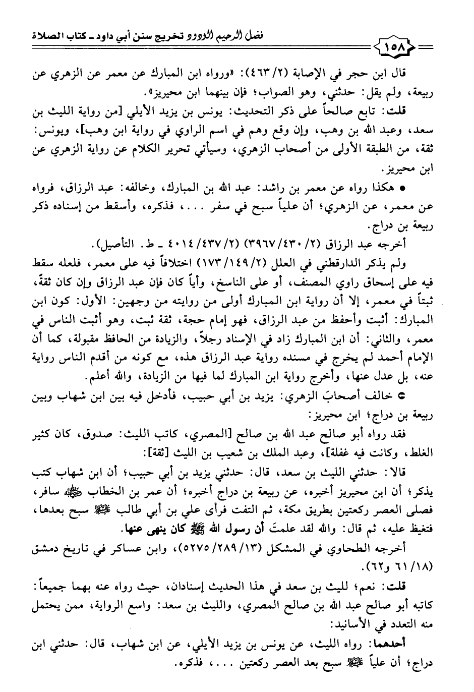 قالا: حدثني الليث بن سعد، قال: حدثني يزيد بن أبي حبيب؛ أن ابن شهاب كتب يذكر؛ أن ابن محيريز أخبره، عن ربيعة بن دراج أخبره؛ أن عمر بن الخطاب -رضي الله عنه- سافر، فصلى العصر ركعتين بطريق مكة، ثم التفت فرأى علي بن أبي طالب -عليه السلام- سبح بعدها، فتغيظ عليه، ثم قال: والله لقد علمتَ أن رسول الله -صلى الله عليه وسلم- كان ينهى عنها.