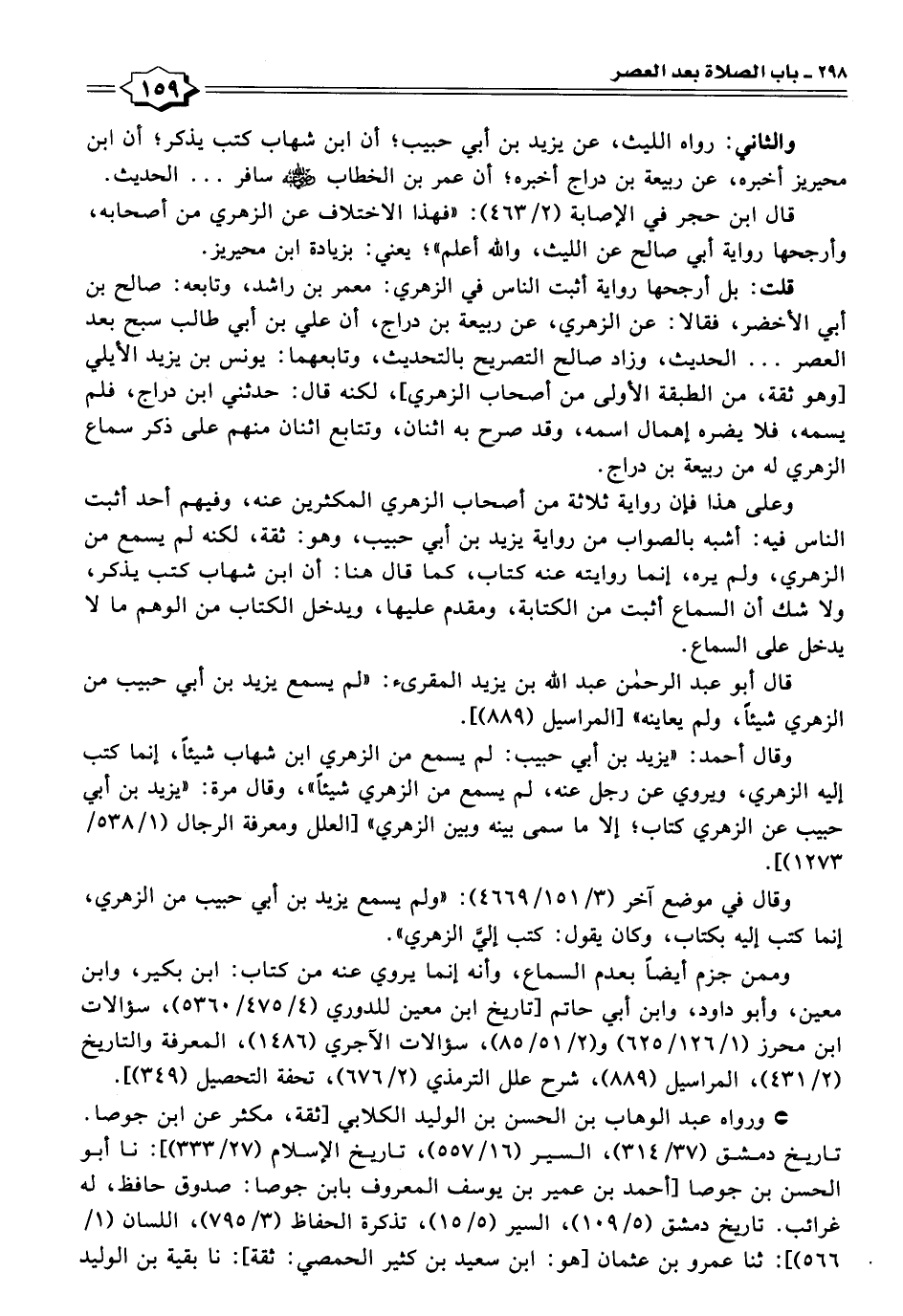 قلت: بل أرجحها رواية أثبت الناس في الزهري: معمر بن راشد، وتابعه: صالح بن أبي الأخضر، فقالا: عن الزهري، عن ربيعة بن دراج، أن علي بن أبي طالب سبح بعد العصر ... الحديث، وزاد صالح التصريح بالتحديث، وتابعهما: يونس بن يزيد الأيلي [وهو ثقة، من الطبقة الأولى من أصحاب الزهري]، لكنه قال: حدثني ابن دراج، فلم يسمه، فلا يضره إهمال اسمه، وقد صرح به اثنان، وتتابع اثنان منهم على ذكر سماع الزهري له من ربيعة بن دراج.