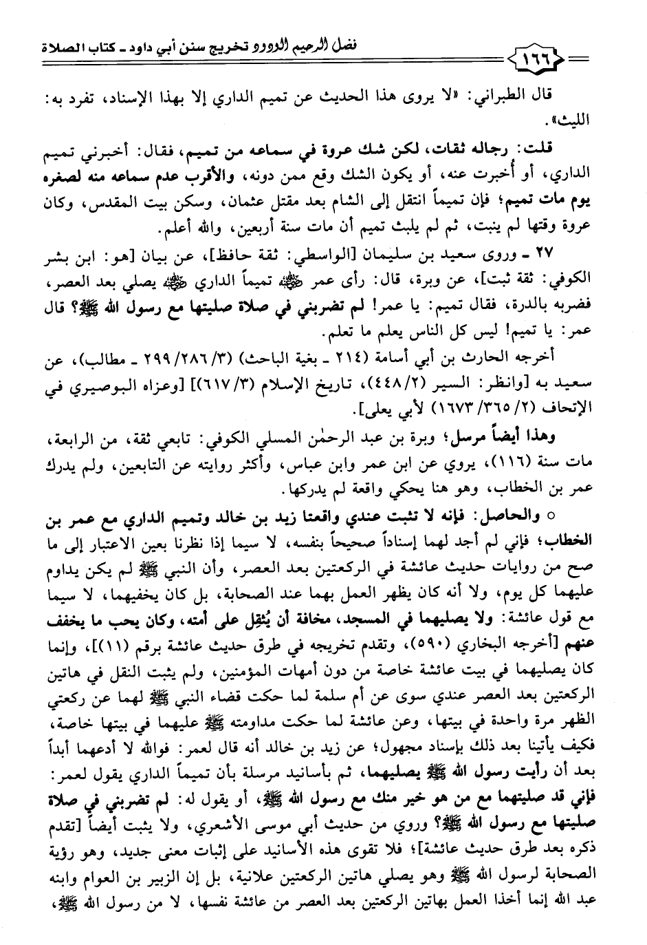 * والحاصل: فإنه لا تثبت عندي واقعتا زيد بن خالد وتميم الداري مع عمر بن الخطاب؛ فإني لم أجد لهما إسنادًا صحيحًا بنفسه، لا سيما إذا نظرنا بعين الاعتبار إلى ما صح من روايات حديث عائشة في الركعتين بعد العصر، وأن النبي -صلى الله عليه وسلم- لم يكن يداوم عليهما كل يوم، ولا أنه كان يظهر العمل بهما عند الصحابة، بل كان يخفيهما، لا سيما مع قول عائشة: ولا يصليهما في المسجد، مخافة أن يُثقِل على أمته، وكان يحب ما يخفف عنهم [أخرجه البخاري (٥٩٠)، وتقدم تخريجه في طرق حديث عائشة برقم (١١)]، وإنما كان يصليهما في بيت عائشة خاصة من دون أمهات المؤمنين، ولم يثبت النقل في هاتين الركعتين بعد العصر عندي سوى عن أم سلمة لما حكت قضاء النبي -صلى الله عليه وسلم- لهما عن ركعتي الظهر مرة واحدة في بيتها، وعن عائشة لما حكت مداومته -صلى الله عليه وسلم- عليهما في بيتها خاصة، فكيف يأتينا بعد ذلك بإسناد مجهول؛ عن زيد بن خالد أنه قال لعمر: فوالله لا أدعهما أبدًا بعد أن رأيت رسول الله -صلى الله عليه وسلم- يصليهما، ثم بأسانيد مرسلة بأن تميمًا الداري يقول لعمر: فإني قد صليتهما مع من هو خير منك مع رسول الله -صلى الله عليه وسلم-، أو يقول له: لم تضربني في صلاة صليتها مع رسول الله -صلى الله عليه وسلم-؟ وروي من حديث أبي موسى الأشعري، ولا يثبت أيضًا [تقدم ذكره بعد طرق حديث عائشة]؛ فلا تقوى هذه الأسانيد على إثبات معنى جديد، وهو رؤية الصحابة لرسول الله -صلى الله عليه وسلم- وهو يصلي هاتين الركعتين علانية، بل إن الزبير بن العوام وابنه عبد الله إنما أخذا العمل بهاتين الركعتين بعد العصر من عائشة نفسها، لا من رسول الله -صلى الله عليه وسلم-،