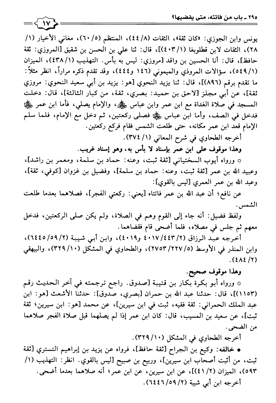 ° ورواه أبو بكرة بكار بن قتيبة [صدوق. راجع ترجمته في آخر الحديث رقم (١١٥٣)]، قال: حدثنا عبد الله بن حمران [بصري، صدوق]: حدثنا الأشعث [هو: ابن عبد الملك الحمراني: ثقة فقيه، ثبت في ابن سيرين]، عن محمد [هو: ابن سيرين؛ ثقة ثبت]، عن سعيد بن المسيب، قال: كان ابن عمر إذا لم يصلهما قبل صلاة الفجر صلاهما من الضحى.