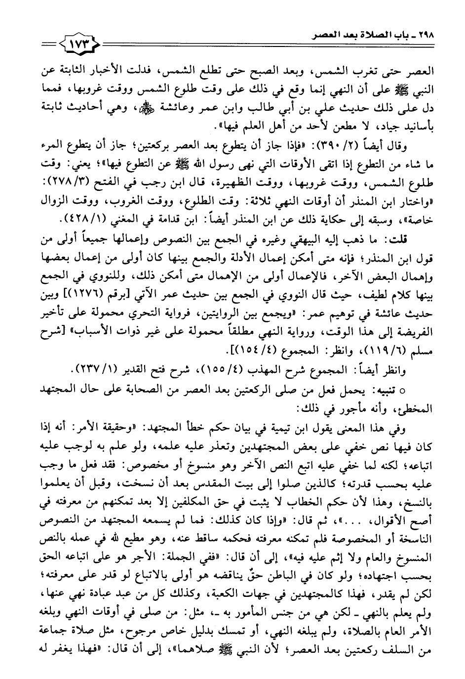 وقال أيضًا (٢/ ٣٩٠): "فإذا جاز أن يتطوع بعد العصر بركعتين؛ جاز أن يتطوع المرء ما شاء من التطوع إذا اتقى الأوقات التي نهى رسول الله - صلى الله عليه وسلم - عن التطوع فيها"؛ يعني: وقت طلوع الشمس، ووقت غروبها، ووقت الظهيرة، قال ابن رجب في الفتح (٣/ ٢٧٨): "واختار ابن المنذر أن أوقات النهي ثلاثة: وقت الطلوع، ووقت الغروب، ووقت الزوال خاصة"، وسبقه إلى حكاية ذلك عن ابن المنذر أيضًا: ابن قدامة في المغني (١/ ٤٢٨).