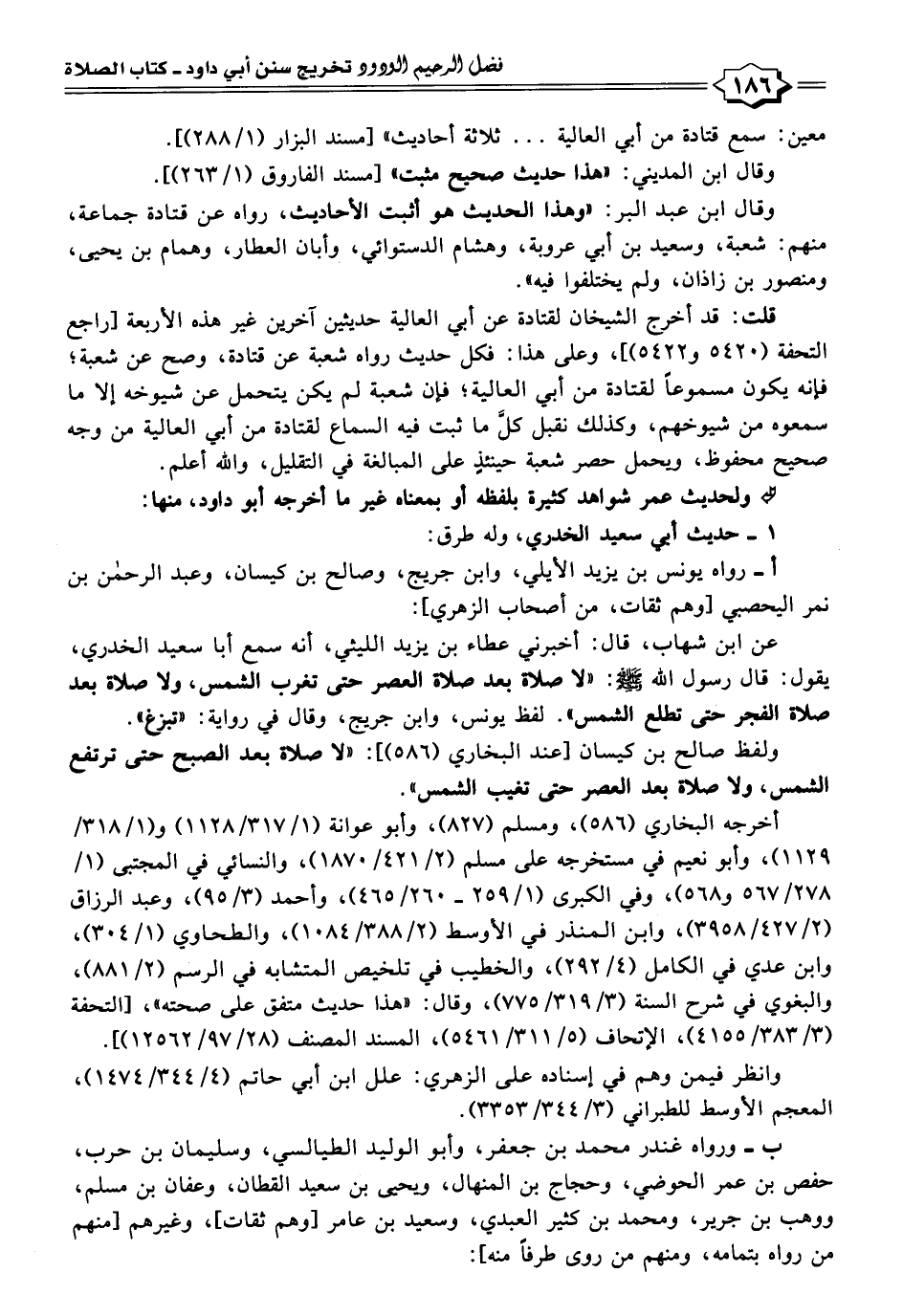 قلت: قد أخرج الشيخان لقتادة عن أبي العالية حديثين آخرين غير هذه الأربعة [راجع التحفة (٥٤٢٠ و ٥٤٢٢)]، وعلى هذا: فكل حديث رواه شعبة عن قتادة، وصح عن شعبة؛ فإنه يكون مسموعًا لقتادة من أبي العالية؛ فإن شعبة لم يكن يتحمل عن شيوخه إلا ما سمعوه من شيوخهم، وكذلك نقبل كلَّ ما ثبت فيه السماع لقتادة من أبي العالية من وجه صحيح محفوظ، ويحمل حصر شعبة حينئذٍ على المبالغة في التقليل، والله أعلم.