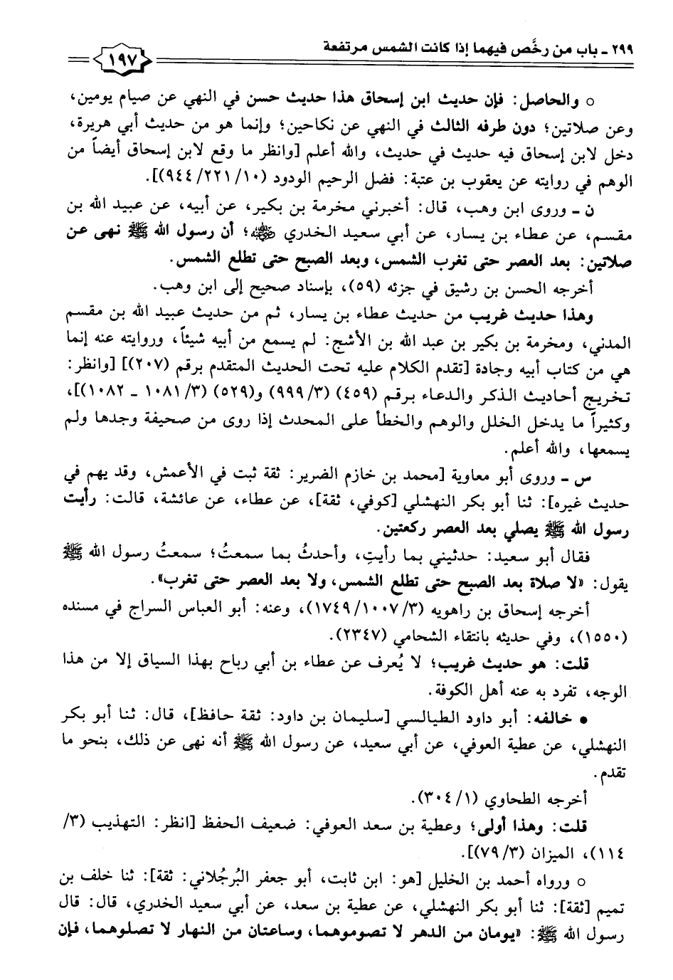 ° والحاصل: فإن حديث ابن إسحاق هذا حديث حسن في النهي عن صيام يومين، وعن صلاتين؛ دون طرفه الثالث في النهي عن نكاحين؛ وإنما هو من حديث أبي هريرة، دخل لابن إسحاق فيه حديث في حديث، والله أعلم [وانظر ما وقع لابن إسحاق أيضًا من الوهم في روايته عن يعقوب بن عتبة: فضل الرحيم الودود (١٠/ ٢٢١/ ٩٤٤)].