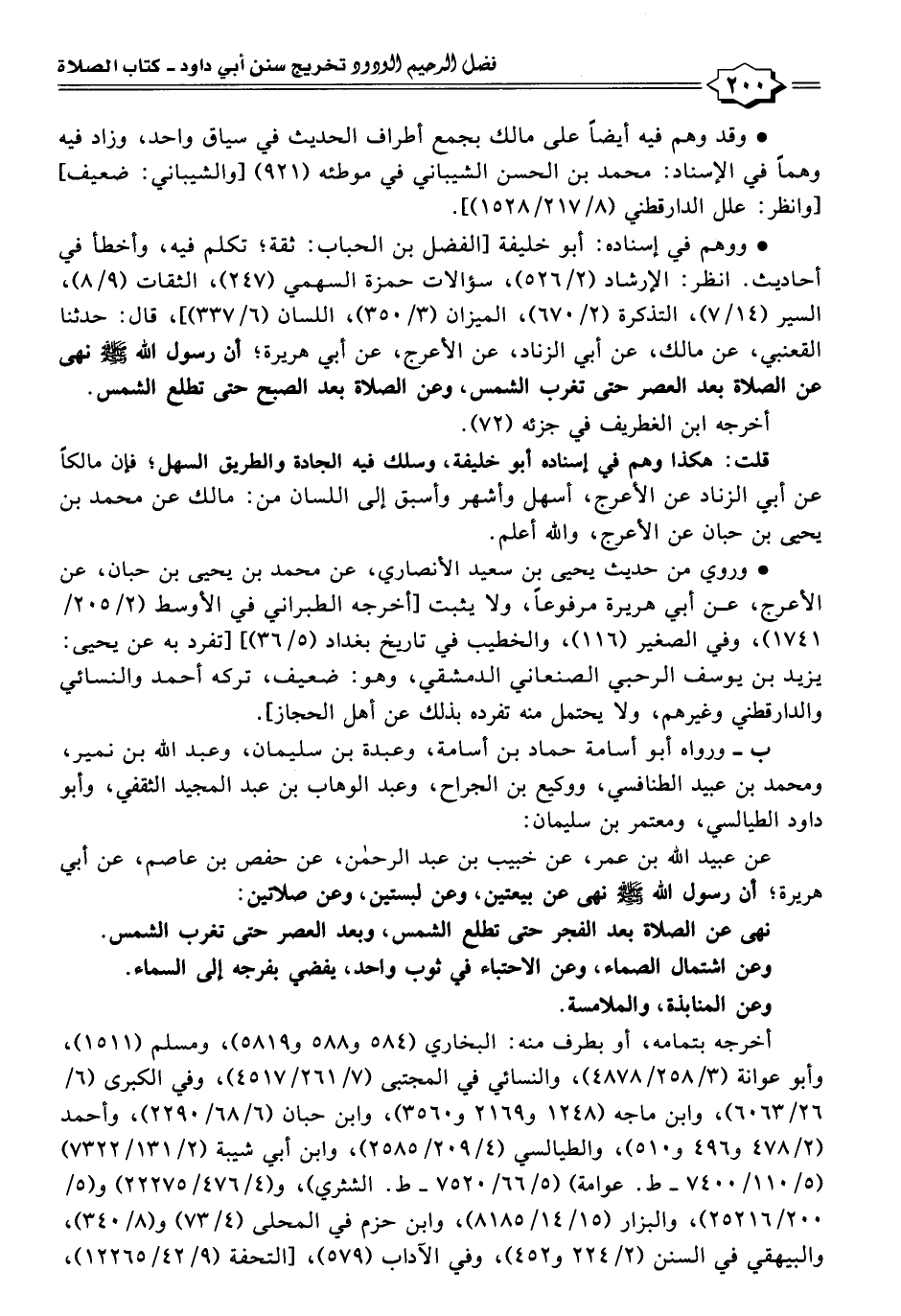 • ووهم في إسناده: أبو خليفة [الفضل بن الحباب: ثقة؛ تكلم فيه، وأخطأ في أحاديث. انظر: الإرشاد (٢/ ٥٢٦)، سؤالات حمزة السهمي (٢٤٧)، الثقات (٩/ ٨)، السير (١٤/ ٧)، التذكرة (٢/ ٦٧٠)، الميزان (٣/ ٣٥٠)، اللسان (٦/ ٣٣٧)]، قال: حدثنا القعنبي، عن مالك، عن أبي الزناد، عن الأعرج، عن أبي هريرة؛ أن رسول الله - صلى الله عليه وسلم - نهى عن الصلاة بعد العصر حتى تغرب الشمس، وعن الصلاة بعد الصبح حتى تطلع الشمس.
