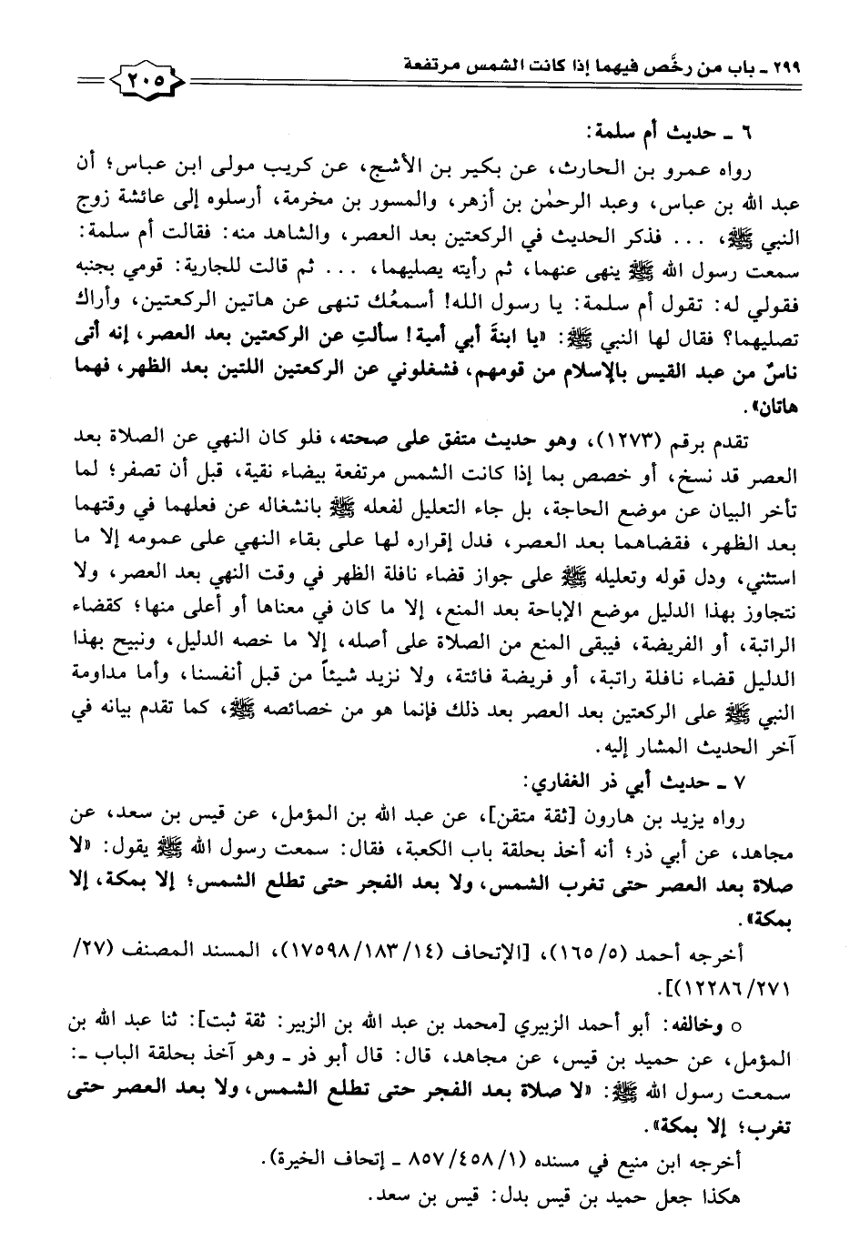 تقدم برقم (١٢٧٣)، وهو حديث متفق على صحته، فلو كان النهي عن الصلاة بعد العصر قد نسخ، أو خصص بما إذا كانت الشمس مرتفعة بيضاء نقية، قبل أن تصفر؛ لما تأخر البيان عن موضع الحاجة، بل جاء التعليل لفعله - صلى الله عليه وسلم - بانشغاله عن فعلهما في وقتهما بعد الظهر، فقضاهما بعد العصر، فدل إقراره لها على بقاء النهي على عمومه إلا ما استثني، ودل قوله وتعليله - صلى الله عليه وسلم - على جواز قضاء نافلة الظهر في وقت النهي بعد العصر، ولا نتجاوز بهذا الدليل موضع الإباحة بعد المنع، إلا ما كان في معناها أو أعلى منها؛ كقضاء الراتبة، أو الفريضة، فيبقى المنع من الصلاة على أصله، إلا ما خصه الدليل، ونبيح بهذا الدليل قضاء نافلة راتبة، أو فريضة فائتة، ولا نزيد شيئًا من قبل أنفسنا، وأما مداومة النبي - صلى الله عليه وسلم - على الركعتين بعد العصر بعد ذلك فإنما هو من خصائصه - صلى الله عليه وسلم -، كما تقدم بيانه في آخر الحديث المشار إليه.