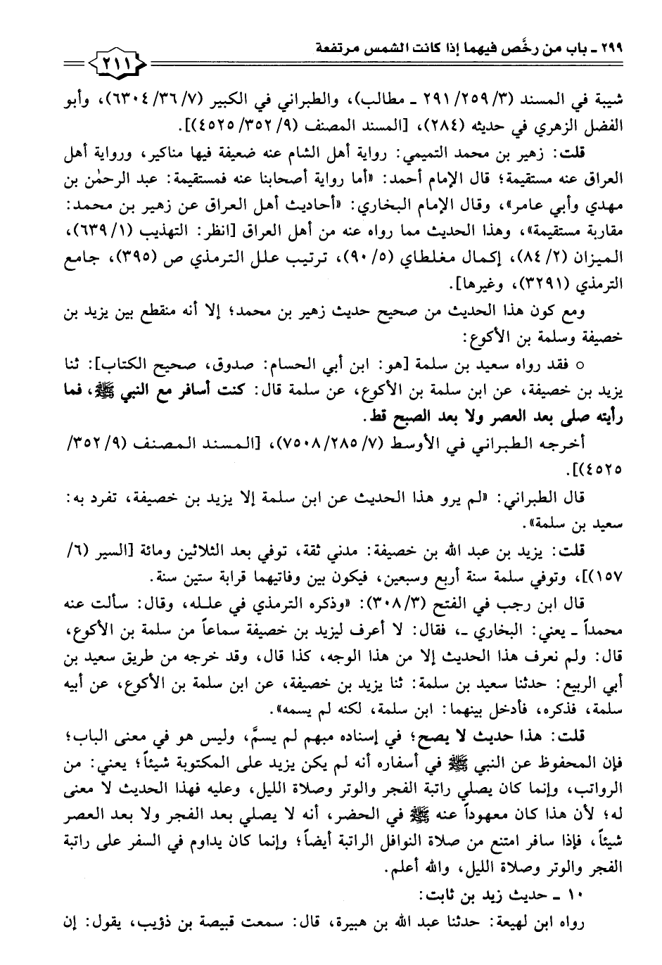 ° فقد رواه سعيد بن سلمة [هو: ابن أبي الحسام: صدوق، صحيح الكتاب]: ثنا يزيد بن خصيفة، عن ابن سلمة بن الأكوع، عن سلمة قال: كنت أسافر مع النبي - صلى الله عليه وسلم -، فما رأيته صلى بعد العصر ولا بعد الصبح قط.