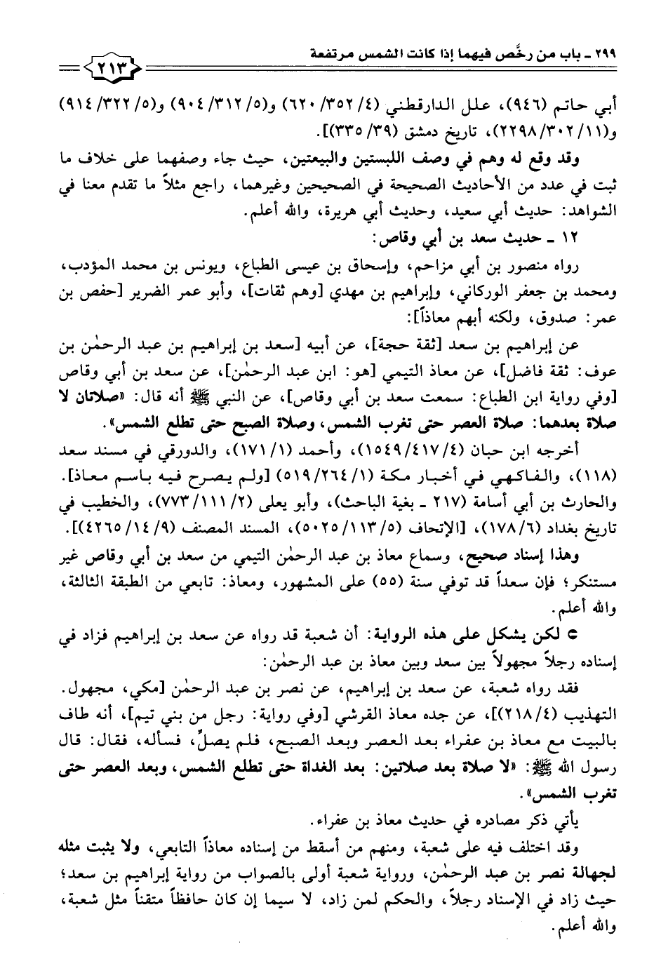 عن إبراهيم بن سعد [ثقة حجة]، عن أبيه [سعد بن إبراهيم بن عبد الرحمن بن عوف: ثقة فاضل]، عن معاذ التيمي [هو: ابن عبد الرحمن]، عن سعد بن أبي وقاص [وفي رواية ابن الطباع: سمعت سعد بن أبي وقاص]، عن النبي - صلى الله عليه وسلم - أنه قال: "صلاتان لا صلاة بعدهما: صلاة العصر حتى تغرب الشمس، وصلاة الصبح حتى تطلع الشمس".