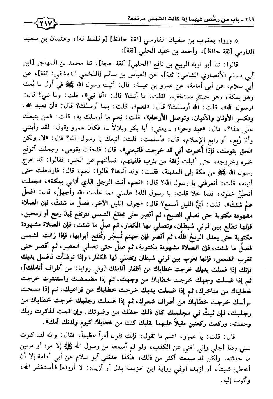 قالوا: ثنا أبو توبة الربيع بن نافع [الحلبي] [ثقة حجة]: ثنا محمد بن المهاجر [ابن أبي مسلم الأنصاري الشامي: ثقة]، عن العباس بن سالم [اللخمي الدمشقي: ثقة]، عن أبي سلام، عن أبي أمامة، عن عمرو بن عبسة، قال: أتيت رسول الله - صلى الله عليه وسلم - في أول ما بُعث وهو بمكة، وهو حينئذٍ مستخفٍ، فقلت: ما أنت؟ قال: "أنا نبي"، قلت: وما نبي؟ قال: "رسول الله"، قلت: الله أرسلك؟ قال: "نعم"، قلت: بما أرسلك؟ قال: "أن تعبد الله، وتكسر الأوثان والأديان، وتوصل الأرحام"، قلت: نِعم ما أرسلك به، قلت: فمن يتبعك على هذا؟، قال: "عبد وحر"، - يعني: أبا بكر وبلالًا -، فكان عمرو يقول: لقد رأيتني وأنا رُبع، أو رابع الإسلام، قال: فأسلمت، قلت: أتبعك يا رسول الله؟ قال: "لا، ولكن الحق بقومك، فإذا أُخبرت أني قد خرجت فاتبعني"، قال: فلحقت بقومي، وجعلت أتوقع خبره وخروجه، حتى أقبلت رُفقة من يثرب فلقيتهم، فسألتهم عن الخبر، فقالوا: قد خرج رسول الله - صلى الله عليه وسلم - من مكة إلى المدينة، فقلت: وقد أتاها؟ قالوا: نعم، قال: فارتحلت حتى أتيته، قلت: أتعرفني يا رسول الله؟ قال: "نعم، أنت الرجل الذي أتاني بمكة"، فجعلت أتحيَّنُ خلوته، فلما خلا قلت: يا رسول الله! علمني مما علمك الله وأجهلُ، قال: "فسلْ عمَّ شئتَ"، قلت: أيُّ الليل أسمع؟ قال: "جوف الليل الآخر، فصل ما شئتَ، فإن الصلاة مشهودة مكتوبة حتى تصلي الصبح، ثم أقصِر حتى تطلعَ الشمس فترتفع قِيدَ رمح أو رمحين، فإنها تطلع بين قرني شيطان، وتصلي لها الكفار، ثم صلِّ ما شئت، فإن الصلاة مشهودة مكتوبة حتى يعدل الرمحُ ظلَّه، ثم أقصر فإن جهنم تُسجَر وتُفتح أبوابها، فإذا زالت الشمس فصلِّ ما شئت، فإن الصلاة مشهودة مكتوبة، ثم صلِّ حتى تصلي العصر، ثم أقصر حتى تغرب الشمس، فإنها تغرب بين قرني شيطان وتصلي لها الكفار، وإذا توضأت فأغسل يديك فإنك إذا غسلت يديك خرجت خطاياك من أظفار أناملك [وفي رواية: من أطراف أناملك]، ثم إذا غسلت وجهك خرجت خطاياك من وجهك، ثم إذا مضمضت واستنثرت خرجت خطاياك من مناخرك، ثم إذا غسلت يديك خرجت خطاياك من ذراعيك، ثم إذا مسحت برأسك خرجت خطاياك من أطراف شعرك، ثم إذا غسلت رجليك خرجت خطاياك من رجليك، فإن ثبتَّ في مجلسك كان ذلك حظك من وضوئك، وإن قمت فذكرت ربك وحمدته، وركعت ركعتين مقبلًا عليهما بقلبك كنت من خطاياك كيوم ولدتك أمك".