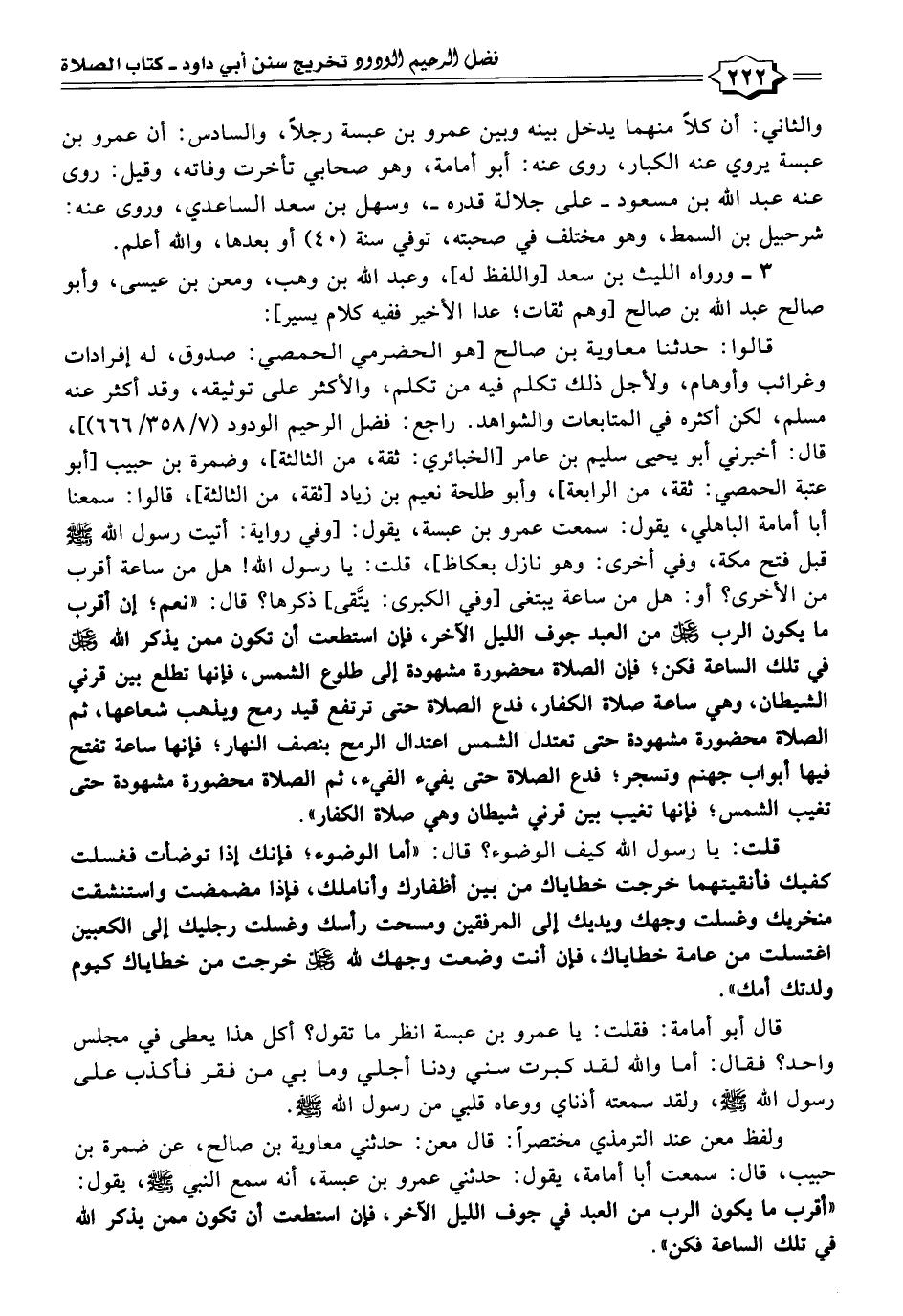 ولفظ معن عند الترمذي مختصرًا: قال معن: حَدَّثَنِي معاوية بن صالح، عن ضمرة بن حبيب، قال: سمعت أبا أمامة، يقول: حَدَّثَنِي عمرو بن عبسة، أنه سمع النَّبِيّ - صلى الله عليه وسلم -، يقول: "أقرب ما يكون الرب من العبد في جوف الليل الآخر، فإن استطعت أن تكون ممن يذكر الله في تلك الساعة فكن".