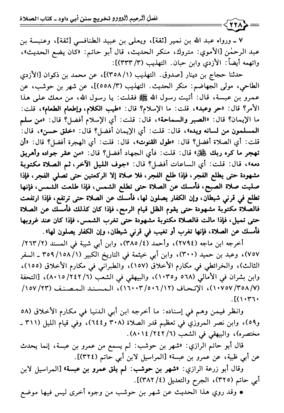 قال أبو حاتم الرازي: "شهر بن حوشب: لم يسمع من عمرو بن عبسة، إنما يحدث عن أبي ظبية، عن عمرو بن عبسة" [المراسيل لابن أبي حاتم (٣٢٤)].