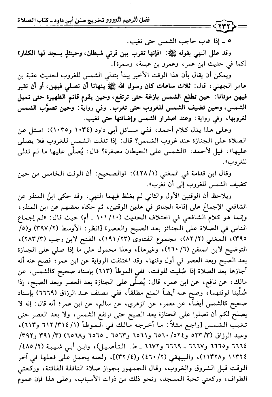 ويلاحظ أن الوقتين الأول والثاني لم يغلظ فيهما النهي، وقد حكى ابنُ المنذر عن الشافعي الإجماعَ على إقامة الجنائز في هذين الوقتين، ثم حكاه بعضهم عن ابن المنذر، وإنما هو كلام الشافعي في اختلاف الحديث (١٠/ ١٠١ - أم) حيث قال: "ثم إجماع الناس في الصلاة على الجنائز بعد الصبح والعصر" [انظر: الأوسط (٢/ ٣٩٧) و (٥/ ٣٩٥)، المغني (٢/ ٨٢)، مجموع الفتاوى (٢٣/ ١٩١)، الفتح لابن رجب (٣/ ٢٨٣)، التوضيح لابن الملقن (٦/ ٢٦٠)، وغيرها]، وهذا محمول على ما إذا صلي على الجنازة بعد الصبح وبعد العصر في أول وقتها، وقد اختلفت الرواية عن ابن عمر؛ فصح عنه أنه أجازها بعد الصلاة إذا صُليت للوقت، ففي الموطأ (٦١٣) بإسناد صحيح كالشمس، عن مالك، عن نافع، عن ابن عمر، قال: يُصلَّى على الجنازة بعد العصر وبعد الصبح، إذا صُلّيتا لوقتهما، وصح عنه أيضًا المنع مطلقًا، ففي مصنف عبد الرزاق (٦٦٦٩) بإسناد صحيح كالشمس أيضًا، عن معمر، عن الزُّهري، عن سالم، عن ابن عمر؛ أنه قال: إنه لا يصلح لكم أن تصلوا على الجنازة بعد الصبح حتى ترتفع الشمس، ولا بعد العصر حتى تغيب الشمس [راجع مثلًا: ما أخرجه مالك في الموطأ (١/ ٣١٤/ ٦١٢ و ٦١٣)، وعبد الرزاق (٣/ ٥٢٣ و ٥٢٤/ ٦٥٦٠ و ٦٥٦١ و ٦٥٦٣ - ٦٥٦٥ و ٦٥٦٨) (٣/ ٣٩١ و ٣٩٢/ ٦٦٦٤ و ٦٦٦٥ و ٦٦٦٧ - ٦٦٦٩ و ٦٦٧٢ - ط. التأصيل)، وابن أبي شيبة (٢/ ٤٨٥/ ١١٣٢٤ و ١١٣٢٨)، والبيهقي (٢/ ٤٦٠) و (٤/ ٣٢)]، ولعله يحمل على فعلها في آخر الوقت قبل الشروق والغروب، وقال الجمهور بجواز صلاة النافلة الفائتة، وركعتي الطواف، وركعتي تحية المسجد، ونحو ذلك من ذوات الأسباب، وعلى هذا فإن عموم