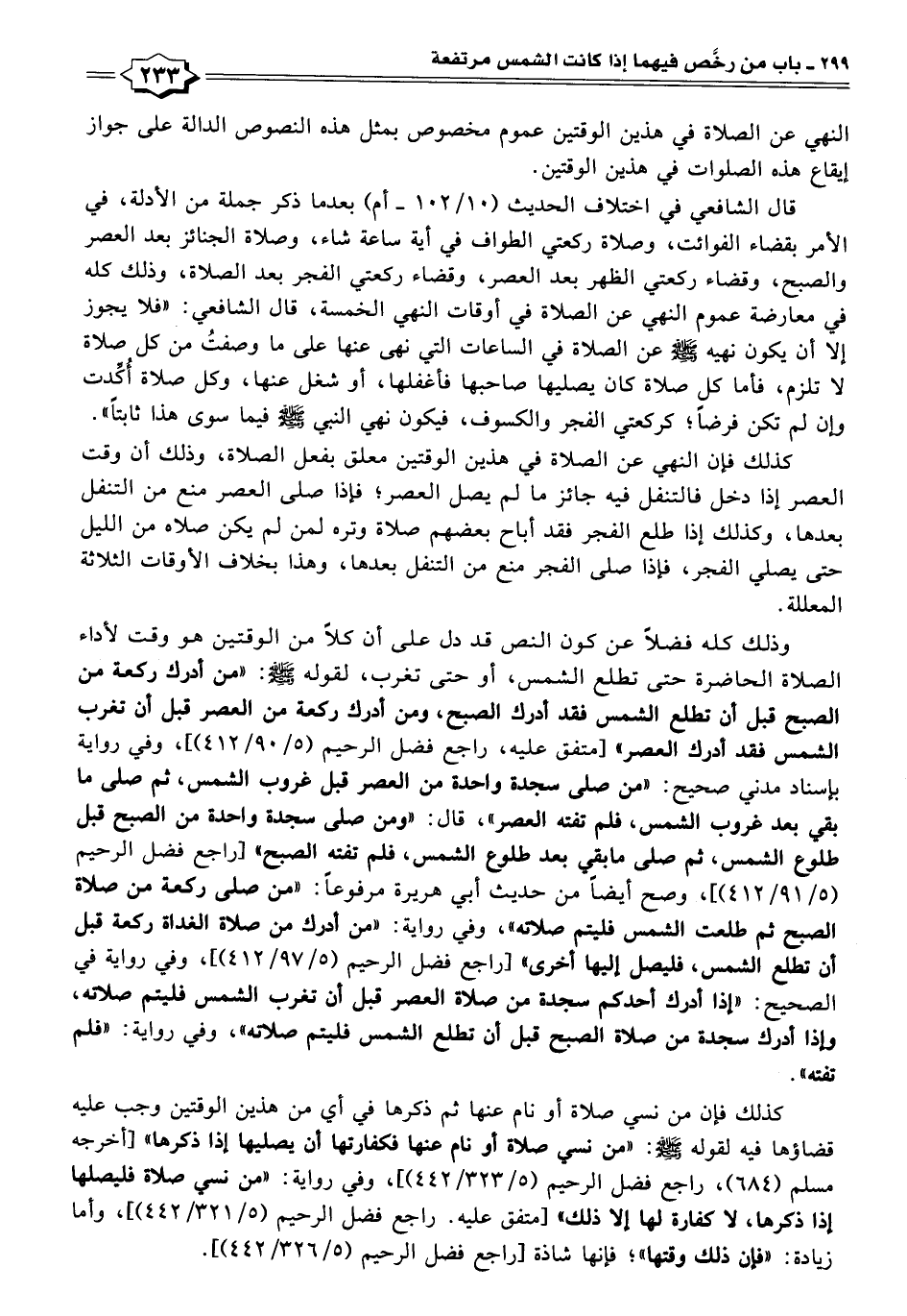 قال الشافعي في اختلاف الحديث (١٠/ ١٠٢ - أم) بعدما ذكر جملة من الأدلة، في الأمر بقضاء الفوائت، وصلاة ركعتي الطواف في أية ساعة شاء، وصلاة الجنائز بعد العصر والصبح، وقضاء ركعتي الظهر بعد العصر، وقضاء ركعتي الفجر بعد الصلاة، وذلك كله في معارضة عموم النهي عن الصلاة في أوقات النهي الخمسة، قال الشافعي: "فلا يجوز إِلَّا أن يكون نهيه - صلى الله عليه وسلم - عن الصلاة في الساعات التي نهى عنها على ما وصفتُ من كل صلاة لا تلزم، فأما كل صلاة كان يصليها صاحبها فأغفلها، أو شغل عنها، وكل صلاة أُكِّدت وإن لم تكن فرضًا؛ كركعتي الفجر والكسوف، فيكون نهي النَّبِيّ - صلى الله عليه وسلم - فيما سوى هذا ثابتًا".