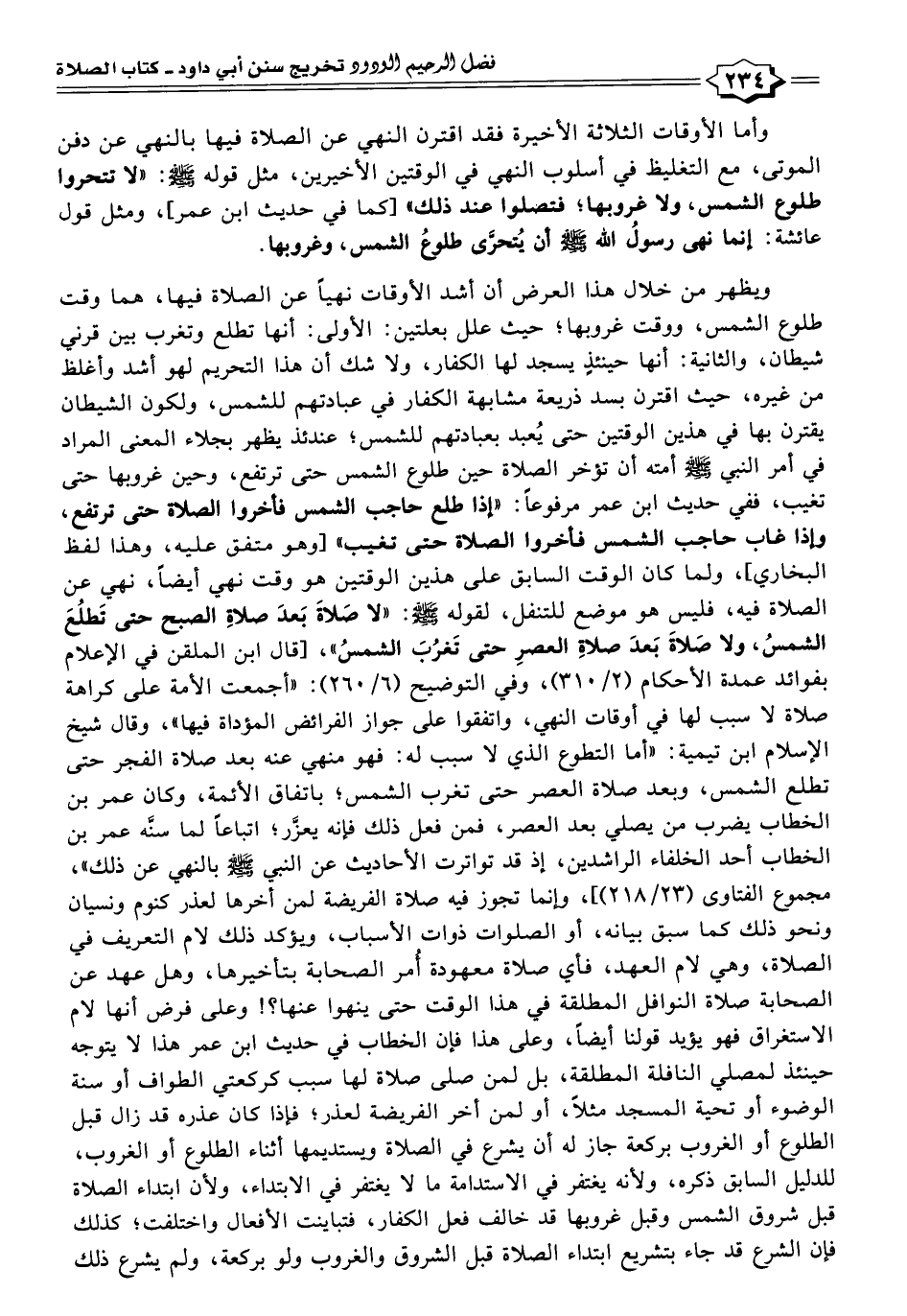 ويظهر من خلال هذا العرض أن أشد الأوقات نهيًا عن الصلاة فيها، هما وقت طلوع الشمس، ووقت غروبها؛ حيث علل بعلتين: الأولى: أنها تطلع وتغرب بين قرني شيطان، والثانية: أنها حينئذٍ يسجد لها الكفار، ولا شك أن هذا التحريم لهو أشد وأغلظ من غيره، حيث اقترن بسد ذريعة مشابهة الكفار في عبادتهم للشمس، ولكون الشيطان يقترن بها في هذين الوقتين حتى يُعبد بعبادتهم للشمس؛ عندئذ يظهر بجلاء المعنى المراد في أمر النَّبِيّ - صلى الله عليه وسلم - أمته أن تؤخر الصلاة حين طلوع الشمس حتى ترتفع، وحين غروبها حتى تغيب، ففي حديث ابن عمر مرفوعًا: "إذا طلع حاجب الشمس فأخروا الصلاة حتى ترتفع، وإذا غاب حاجب الشمس فأخروا الصلاة حتى تغيب" [وهو متفق عليه، وهذا لفظ البخاري]، ولما كان الوقت السابق على هذين الوقتين هو وقت نهي أيضًا، نهي عن الصلاة فيه، فليس هو موضع للتنفل، لقوله - صلى الله عليه وسلم -: "لا صَلاةَ بَعدَ صلاةِ الصبح حتى تَطلُعَ الشمسُ، ولا صَلاةَ بَعدَ صلاة العصرِ حتى تَغْرُبَ الشمسُ"، [قال ابن الملقن في الإعلام بفوائد عمدة الأحكام (٢/ ٣١٠)، وفي التوضيح (٦/ ٢٦٠): "أجمعت الأمة على كراهة صلاة لا سبب لها في أوقات النهي، واتفقوا على جواز الفرائض المؤداة فيها"، وقال شيخ الإسلام ابن تيمية: "أما التطوع الذي لا سبب له: فهو منهي عنه بعد صلاة الفجر حتى تطلع الشمس، وبعد صلاة العصر حتى تغرب الشمس؛ باتفاق الأئمة، وكان عمر بن الخطاب يضرب من يصلي بعد العصر، فمن فعل ذلك فإنه يعزَّر؛ اتباعًا لما سنَّه عمر بن الخطاب أحد الخلفاء الراشدين، إذ قد تواترت الأحاديث عن النَّبِيّ - صلى الله عليه وسلم - بالنهي عن ذلك"، مجموع الفتاوى (٢٣/ ٢١٨)]، وإنّما تجوز فيه صلاة الفريضة لمن أخرها لعذر كنوم ونسيان ونحو ذلك كما سبق بيانه، أو الصلوات ذوات الأسباب، ويؤكد ذلك لام التعريف في الصلاة، وهي لام العهد، فأي صلاة معهودة أمر الصحابة بتأخيرها، وهل عهد عن الصحابة صلاة النوافل المطلقة في هذا الوقت حتى ينهوا عنها؟! وعلى فرض أنها لام الاستغراق فهو يؤيد قولنا أيضًا، وعلى هذا فإن الخطاب في حديث ابن عمر هذا لا يتوجه حينئذ ليصلي النافلة المطلقة، بل لمن صلى صلاة لها سبب كركعتي الطواف أو سنة الوضوء أو تحية المسجد مثلًا، أو لمن أخر الفريضة لعذر؛ فإذا كان عذره قد زال قبل الطلوع أو الغروب بركعة جاز له أن يشرع في الصلاة ويستديمها أثناء الطلوع أو الغروب، للدليل السابق ذكره، ولأنه يغتفر في الاستدامة ما لا يغتفر في الابتداء، ولأن ابتداء الصلاة قبل شروق الشمس وقبل غروبها قد خالف فعل الكفار، فتباينت الأفعال واختلفت؛ كذلك فإن الشرع قد جاء بتشريع ابتداء الصلاة قبل الشروق والغروب ولو بركعة، ولم يشرع ذلك