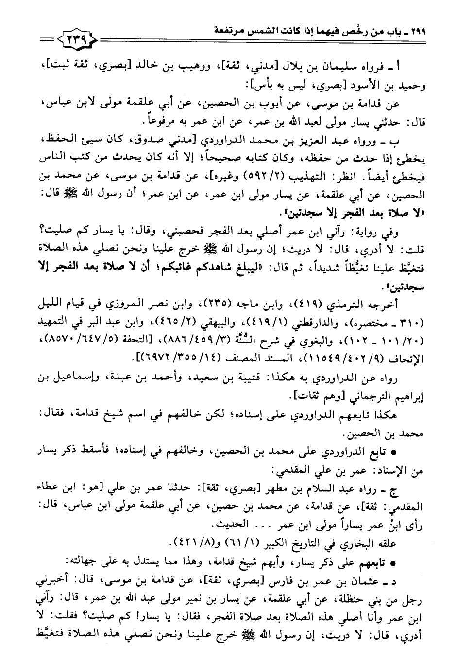 د - عثمان بن عمر بن فارس [بصري، ثقة]، عن قدامة بن موسى، قال: أخبرني رجل من بني حنظلة، عن أبي علقمة، عن يسار بن نمير مولى عبد الله بن عمر، قال: رآني ابن عمر وأنا أصلي هذه الصلاة بعد صلاة الفجر، فقال: يا يسار! كم صليت؟ فقلت: لا أدري، قال: لا دريت، إن رسول الله - صلى الله عليه وسلم - خرج علينا ونحن نصلي هذه الصلاة فتغيَّظ