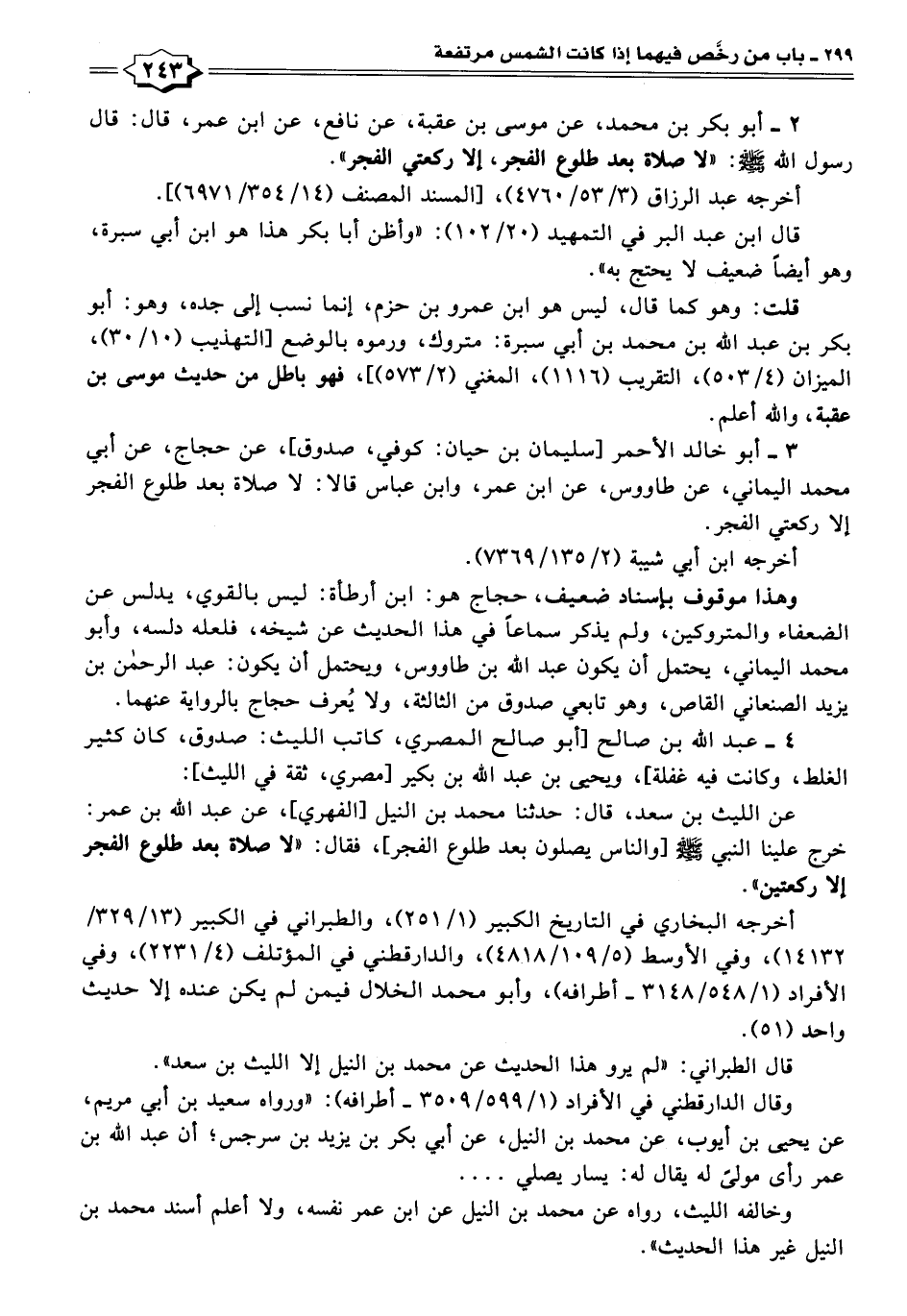 ٣ - أبو خالد الأحمر [سليمان بن حيان: كوفي، صدوق]، عن حجاج، عن أبي محمد اليماني، عن طاووس، عن ابن عمر، وابن عباس قالا: لا صلاة بعد طلوع الفجر إِلَّا ركعتي الفجر.