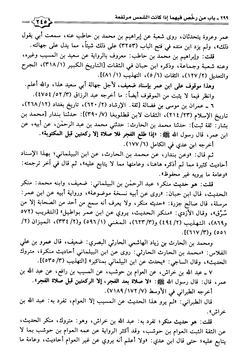 ٦ - عمران بن موسى بن فضالة [ثقة. الإرشاد (٢/ ٦٢٠)، تاريخ بغداد (١٢/ ٢٦٨)، تاريخ الإسلام (٢٣/ ٢١٤)، الثقات لابن قطلوبغا (٧/ ٣٩٥)]: حَدَّثَنَا بندار [محمد بن بشار: ثقة ثبت]: حَدَّثَنَا محمد بن الحارث: حَدَّثَنِي محمد بن عبد الرحمن، عن أبيه، عن ابن عمر، قال رسول الله - صلى الله عليه وسلم -: "إذا طلع الفجر فلا صلاة إِلَّا ركعتين قبل المكتوبة".