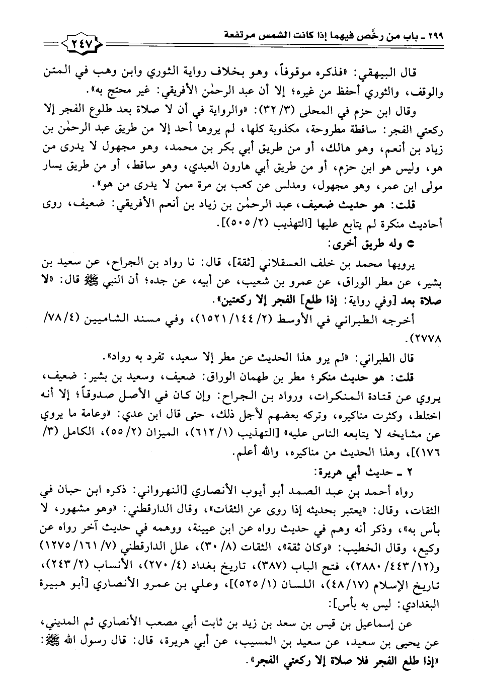 وقال ابن حزم في المحلى (٣/ ٣٢): "والرواية في أن لا صلاة بعد طلوع الفجر إِلَّا ركعتي الفجر: ساقطة مطروحة، مكذوبة كلها، لم يروها أحد إِلَّا من طريق عبد الرحمن بن زياد بن أنعم، وهو هالك، أو من طريق أبي بكر بن محمد، وهو مجهول لا يدرى من هو، وليس هو ابن حزم، أو من طريق أبي هارون العبدي، وهو ساقط، أو من طريق يسار مولى ابن عمر، وهو مجهول، ومدلس عن كعب بن مرة ممن لا يدرى من هو".