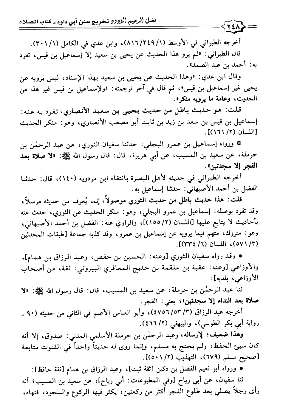 * ورواه إسماعيل بن عمرو البجلي: حَدَّثَنَا سفيان الثوري، عن عبد الرحمن بن حرملة، عن سعيد بن المسيب، عن أبي هريرة، قال: قال رسول الله - صلى الله عليه وسلم -: "لا صلاة بعد الفجر إلا سجدتين".