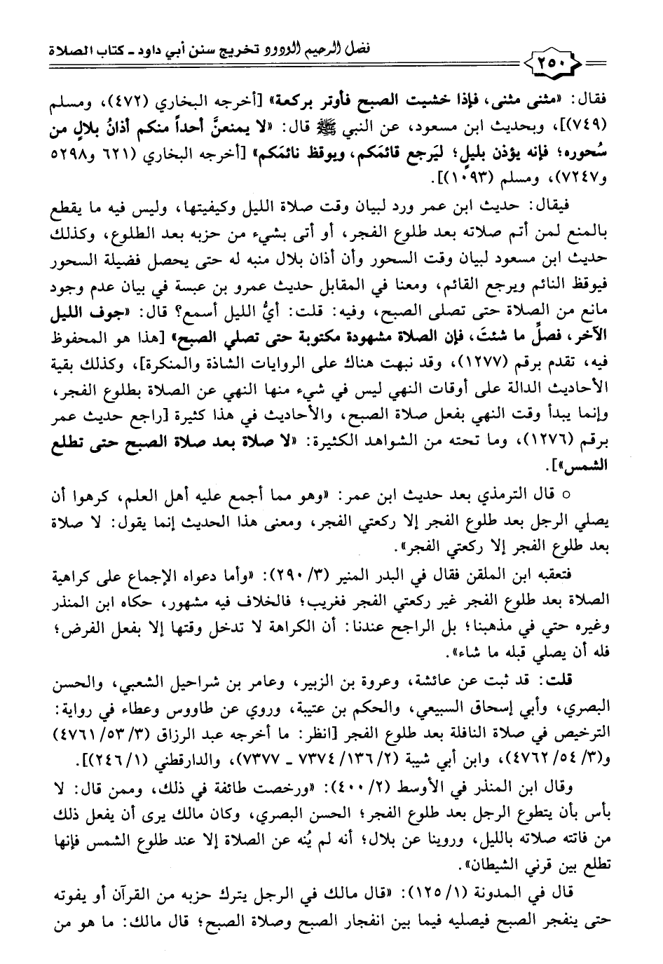 فيقال: حديث ابن عمر ورد لبيان وقت صلاة الليل وكيفيتها، وليس فيه ما يقطع بالمنع لمن أتم صلاته بعد طلوع الفجر، أو أتى بشيء من حزبه بعد الطلوع، وكذلك حديث ابن مسعود لبيان وقت السحور وأن أذان بلال منبه له حتى يحصل فضيلة السحور فيوقظ النائم ويرجع القائم، ومعنا في المقابل حديث عمرو بن عبسة في بيان عدم وجود مانع من الصلاة حتى تصلى الصبح، وفيه: قلت: [أيُّ الليل أسمع؟ قال: "جوف الليل الآخر، فصل ما شئتَ، فإن الصلاة مشهودة مكتوبة حتى تصلي الصبح" [هذا هو المحفوظ فيه، تقدم برقم (١٢٧٧)، وقد نبهت هناك على الروايات الشاذة والمنكرة]، وكذلك بقية الأحاديث الدالة على أوقات النهي ليس في شيء منها النهي عن الصلاة بطلوع الفجر، وإنما يبدأ وقت النهي بفعل صلاة الصبح، والأحاديث في هذا كثيرة أراجع حديث عمر برقم (١٢٧٦)، وما تحته من الشواهد الكثيرة: "لا صلاة بعد صلاة الصبح حتى تطلع الشمس"].