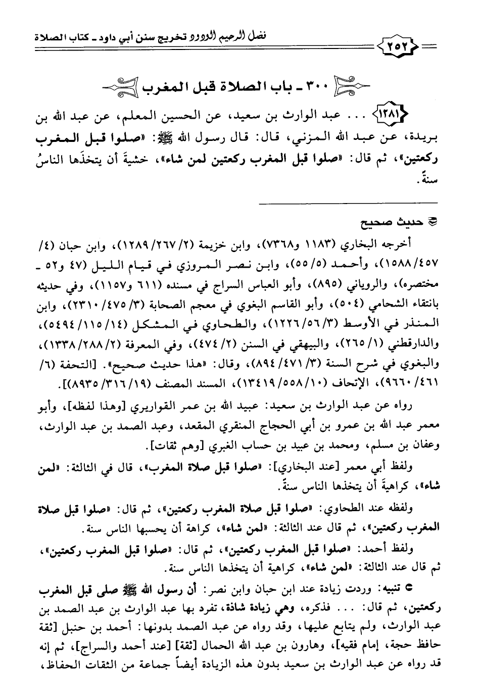 ١٢٨١ - . . . عبد الوارث بن سعيد، عن الحسين المعلم، عن عبد الله بن بُرَيْدَة، عن عبد الله المزني، قال: قال رسول الله - صلى الله عليه وسلم -: "صلوا قبل المغرب ركعتين"، ثم قال: "صلوا قبل المغرب ركعتين لمن شاء"، خشيةَ أن يتخذَها الناسُ سنةً.