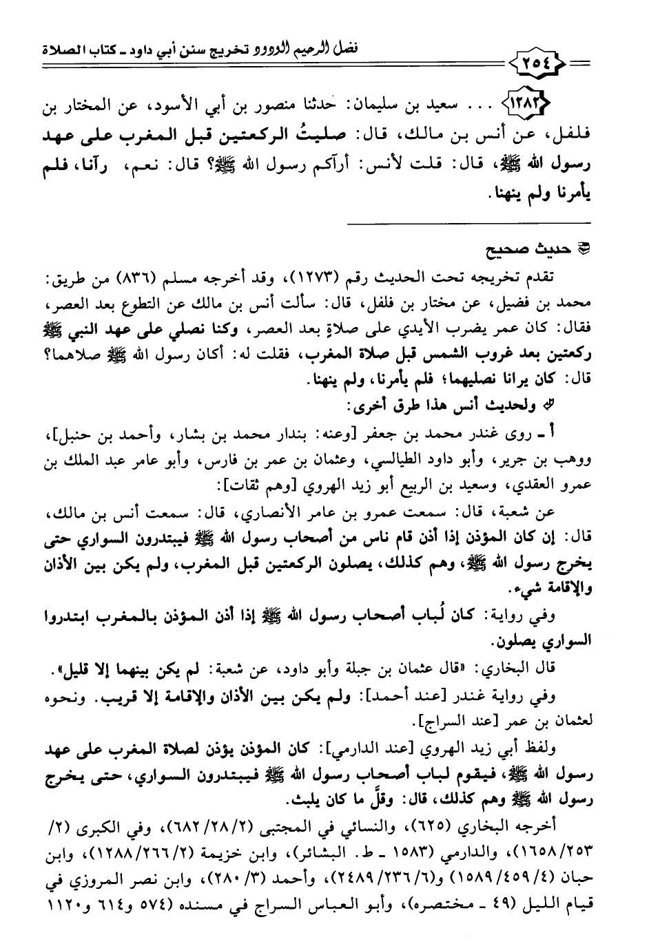 ١٢٨٢ - . . . سعيد بن سليمان: حَدَّثَنَا منصور بن أبي الأسود، عن المختار بن فلفل، عن أنس بن مالك، قال: صليتُ الركعتين قبل المغرب على عهد رسول الله - صلى الله عليه وسلم -، قال: قلت لأنس: أرآكم رسول الله - صلى الله عليه وسلم -؟ قال: نعم، رآنا، فلم يأمرنا ولم ينهنا.