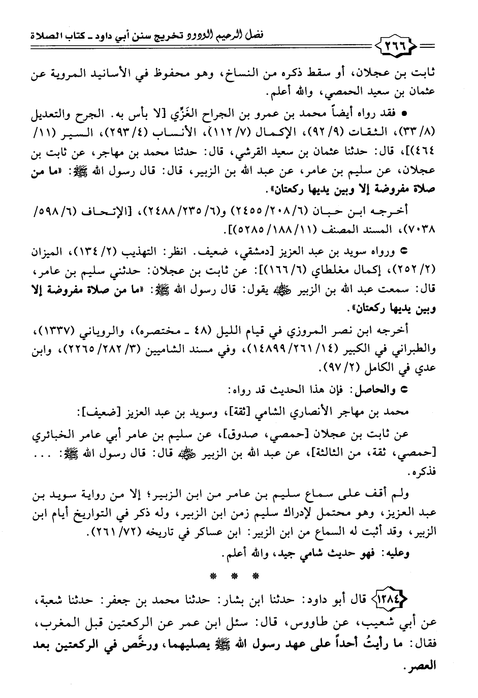 ١٢٨٤ - قال أبو داود: حَدَّثَنَا ابن بشار: حَدَّثَنَا محمد بن جعفر: حَدَّثَنَا شعبة، عن أبي شعيب، عن طاووس، قال: سئل ابن عمر عن الركعتين قبل المغرب، فقال: ما رأيتُ أحدًا على عهد رسول الله - صلى الله عليه وسلم - يصليهما، ورخص في الركعتين بعد العصر.