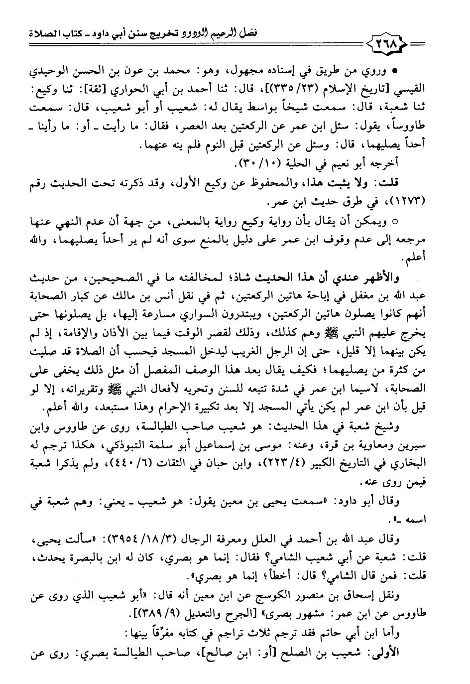 • وروي من طريق في إسناده مجهول، وهو: محمد بن عون بن الحسن الوحيدي القيسي [تاريخ الإسلام (٢٣/ ٣٣٥)]، قال: ثنا أحمد بن أبي الحواري [ثقة]: ثنا وكيع: ثنا شعبة، قال: سمعت شيخًا بواسط يقال له: شعيب أو أبو شعيب، قال: سمعت طاووسًا، يقول: سئل ابن عمر عن الركعتين بعد العصر، فقال: ما رأيت - أو: ما رأينا - أحدًا يصليهما، قال: وسئل عن الركعتين قبل النوم فلم ينه عنهما.
