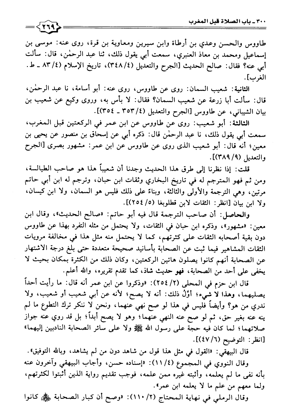 قال ابن حزم في المحلى (٢/ ٢٥٤): "وذكروا عن ابن عمر أنه قال: ما رأيت أحدًا يصليهما، وهذا لا شيء؛ أوَّلُ ذلك: أنه لا يصح؛ لأنه عن أبي شعيب أو شعيب، ولا ندري من هو؟ وأيضًا فليس في هذا لو صح نهي عنهما، ونحن لا ننكر ترك التطوع ما لم ينه عنه بغير حق، ثم لو صح عنه النهي عنهما؛ وهو لا يصح أبدًا؛ بل قد روي عنه جواز صلاتهما؛ لما كان فيه حجة على رسول الله كل ولا على سائر الصحابة النادبين إليهما" [انظر: التوضيح (٦/ ٤٧)].