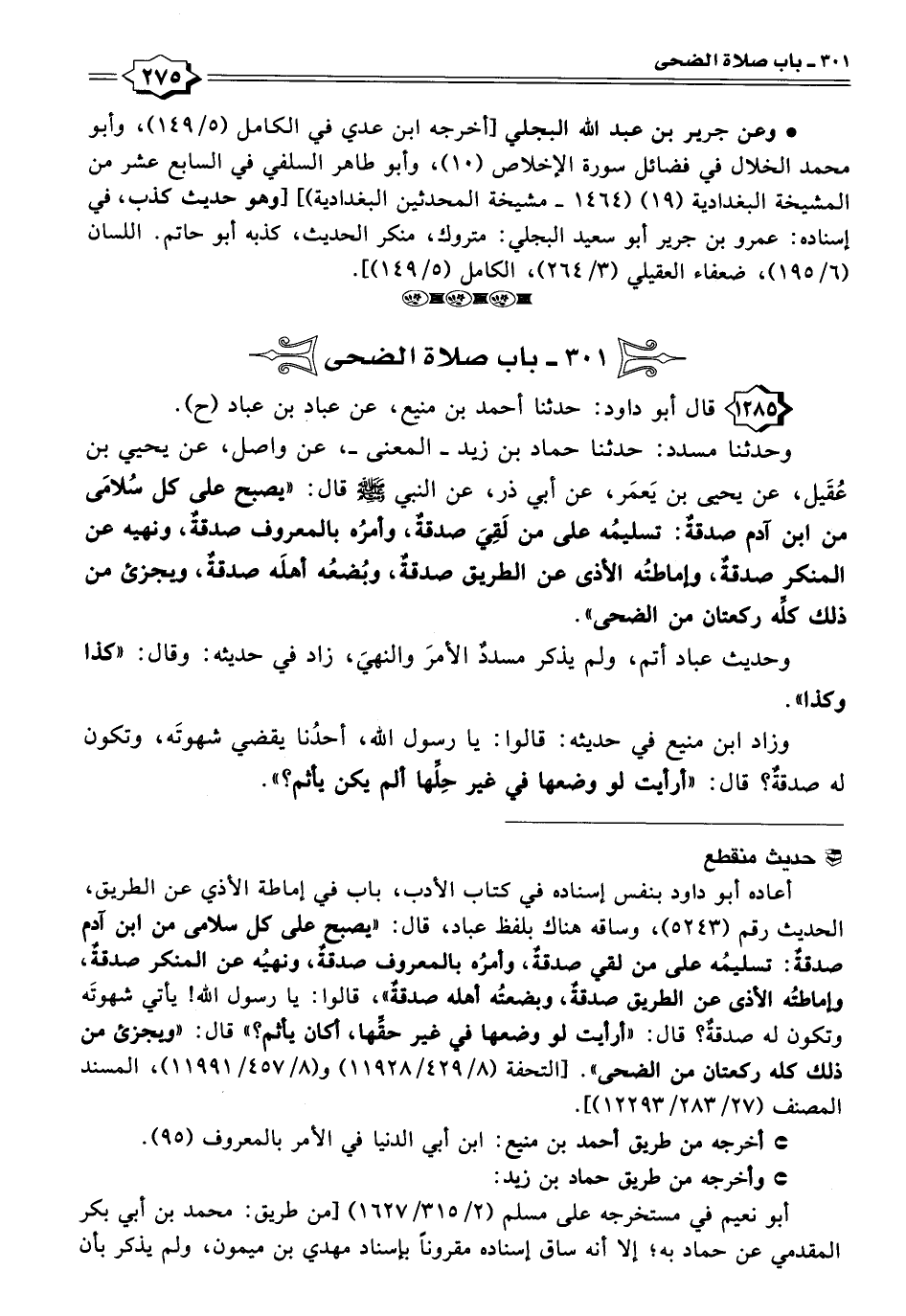 وحدثنا مسدد: حدثنا حماد بن زيد - المعنى -، عن واصل، عن يحيى بن عُقَيل، عن يحيى بن يَعمَر، عن أبي ذر، عن النبي - صلى الله عليه وسلم - قال: "يصبح على كل سُلامَى من ابن آدم صدقة: تسليمُه على من لَقِيَ صدقة، وأمرُه بالمعروف صدقة، ونهيه عن المنكر صدقة، وإماطتُه الأذى عن الطريق صدقة، وبُضعُه أهلَه صدقةٌ، ويجزئ من ذلك كلِّه ركعتان من الضحى".