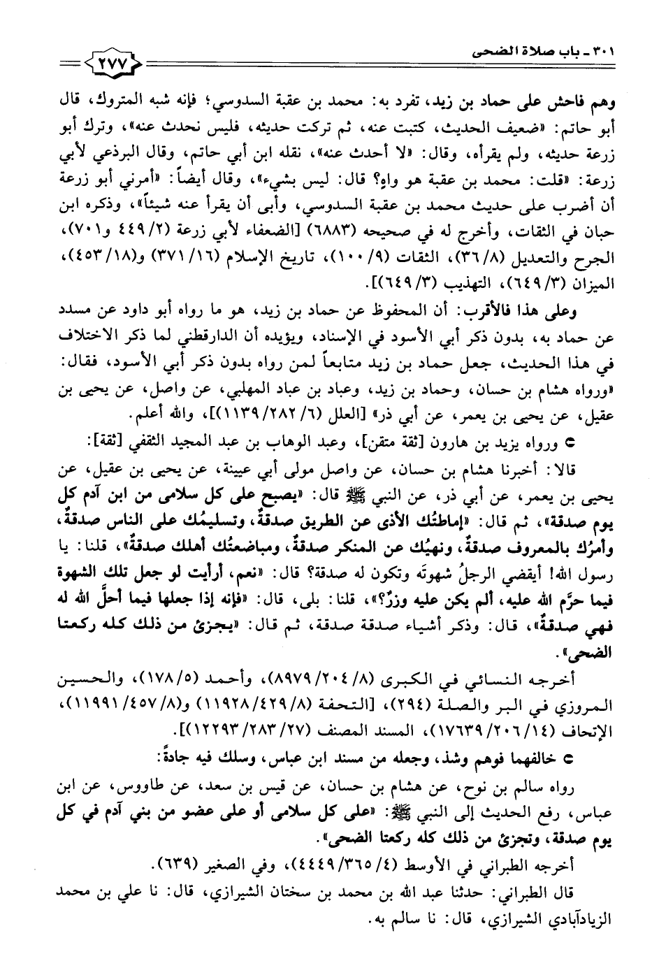 قالا: أخبرنا هشام بن حسان، عن واصل مولى أبي عيينة، عن يحيى بن عقيل، عن يحيى بن يعمر، عن أبي ذر، عن النبي - صلى الله عليه وسلم - قال: "يصبح على كل سلامى من ابن آدم كل يوم صدقةٌ"، ثم قال: "إماطتُك الأذى عن الطريق صدقةٌ، وتسليمُك على الناس صدقةٌ، وأمرُك بالمعروف صدقةٌ، ونهيُك عن المنكر صدقةٌ، ومباضعتُك أهلك صدقةٌ"، قلنا: يا رسول الله! أيقضي الرجلُ شهوتَه وتكون له صدقة؟ قال: "نعم، أرأيت لو جعل تلك الشهوة فيما حرَّم الله عليه، ألم يكن عليه وزرٌ؟ "، قلنا: بلى، قال: "فإنه إذا جعلها فيما أحل الله له فهي صدقةٌ"، قال: وذكر أشياء صدقة صدقة، ثم قال: "يجزئ من ذلك كله ركعتا الضحى".