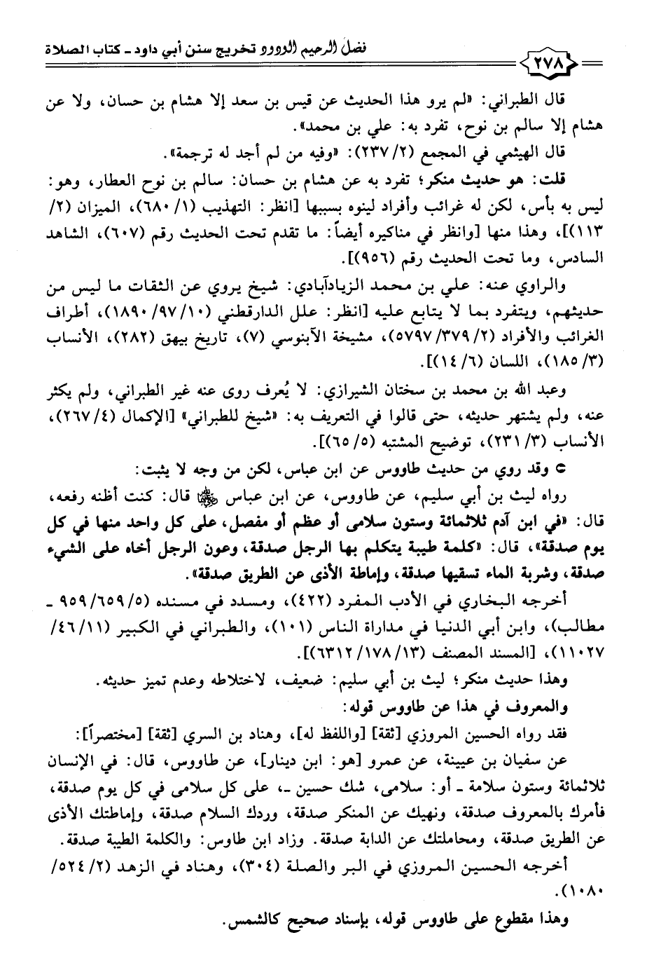 عن سفيان بن عيينة، عن عمرو [هو: ابن دينار]، عن طاووس، قال: في الإنسان ثلاثمائة وستون سلامة - أو: سلامى، شك حسين -، على كل سلامى في كل يوم صدقة، فأمرك بالمعروف صدقة، ونهيك عن المنكر صدقة، وردك السلام صدقة، وإماطتك الأذى عن الطريق صدقة، ومحاملتك عن الدابة صدقة. وزاد ابن طاوس: والكلمة الطيبة صدقة.
