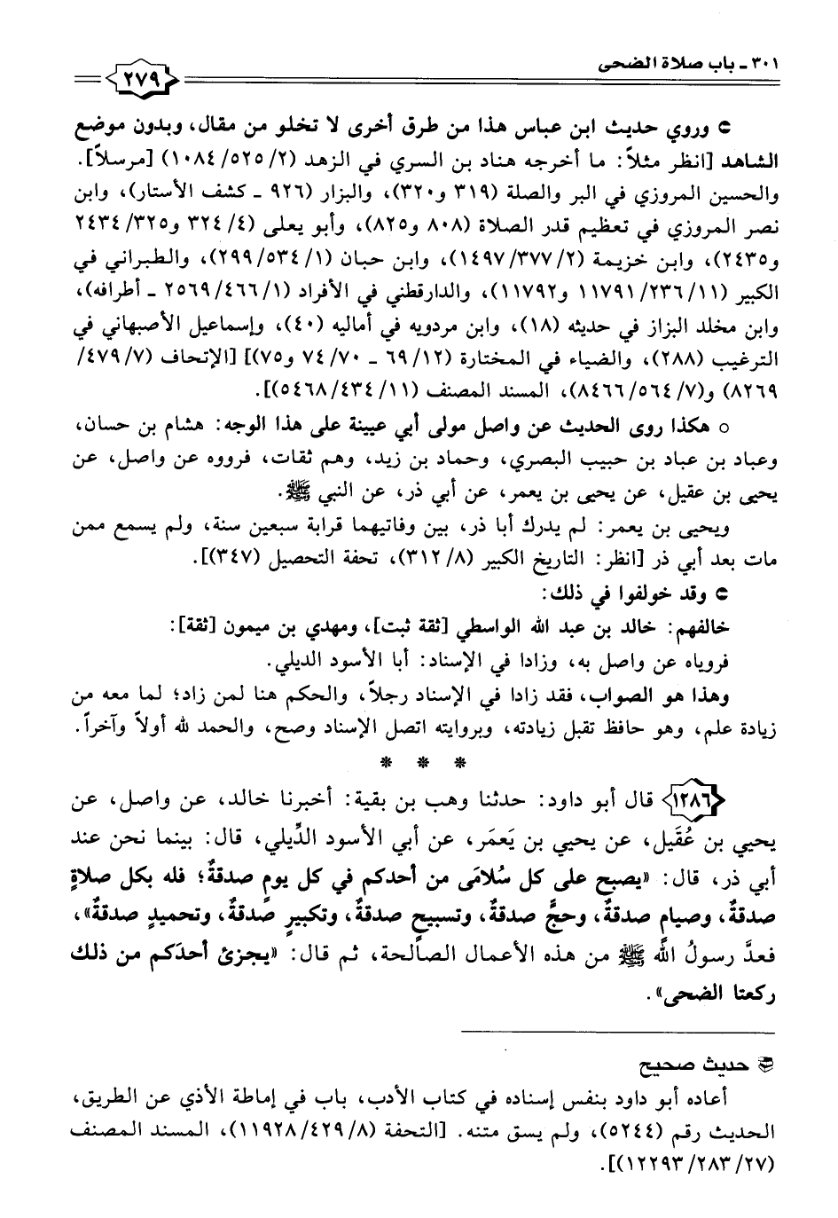 ١٢٨٦ - قال أبو داود: حدثنا وهب بن بقية: أخبرنا خالد، عن واصل، عن يحيى بن عُقَيل، عن يحيى بن يَعمَر، عن أبي الأسود الدِّيلي، قال: بينما نحن عند أبي ذر، قال: "يصبح على كل سُلامَى من أحدكم في كل يومٍ صدقةٌ؛ فله بكل صلاةٍ صدقةٌ، وصيام صدقةٌ، وحجٍّ صدقةٌ، وتسبيحٍ صدقةٌ، وتكبيرٍ صدقةٌ، وتحميدٍ صدقةٌ"، فعدَّ رسولُ الله - صلى الله عليه وسلم - من هذه الأعمال الصالحة، ثم قال: "يجزئ أحدَكم من ذلك ركعتا الضحى".