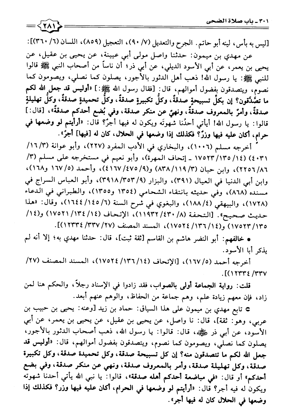 عن مهدي بن ميمون: حدثنا واصل مولى أبي عيينة، عن يحيى بن عقيل، عن يحيى بن يعمر، عن أبي الأسود الديلي، عن أبي ذر؛ أن ناسًا من أصحاب النبي - صلى الله عليه وسلم - قالوا للنبي - صلى الله عليه وسلم -: يا رسول الله! ذهب أهل الدثور بالأجور، يصلون كما نصلي، ويصومون كما نصوم، ويتصدقون بفضول أموالهم، قال: [فقال رسول الله - صلى الله عليه وسلم -:] "أوليس قد جعل الله لكم ما تصَّدَّقون؟ إن بكلِّ تسبيحةٍ صدقةٌ، وكلُّ تكبيرةٍ صدقةٌ، وكلُّ تحميدةٍ صدقةٌ، وكلُّ تهليلةٍ صدقةٌ، وأمرٌ بالمعروف صدقةٌ، ونهيٌ عن منكر صدقةٌ، وفي بُضع أحدكم صدقةٌ"، [قال:] قالوا: يا رسول الله! أيأتي أحدُنا شهوتَه ويكون له فيها أجرٌ؟ قال: "أرأيتم لو وضعها في حرامٍ، أكان عليه فيها وزرٌ؟ فكذلك إذا وضعها في الحلال، كان له أفيها، أجرٌ".