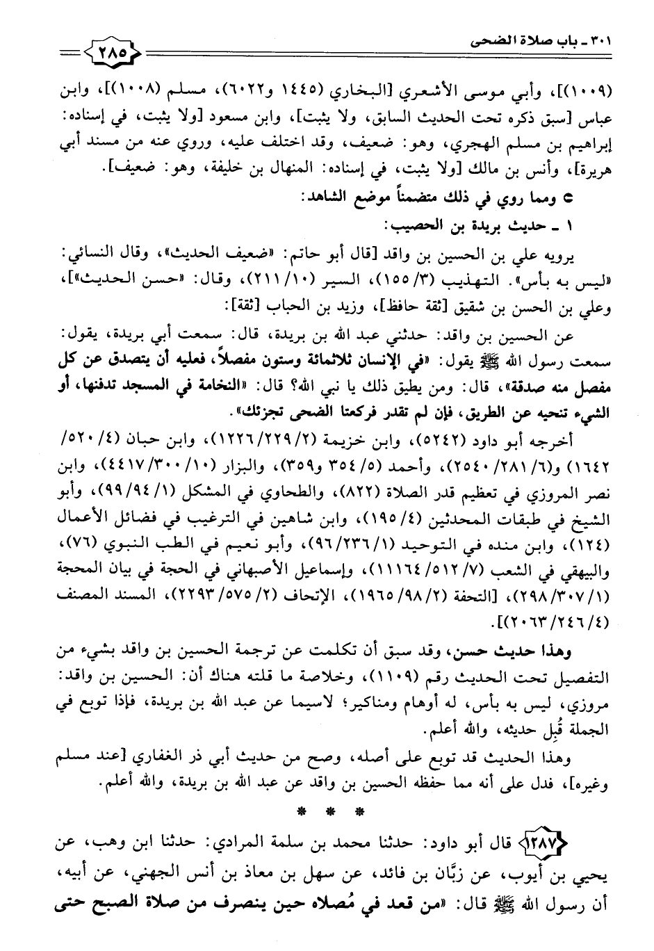 عن الحسين بن واقد: حدثني عبد الله بن بريدة، قال: سمعت أبي بريدة، يقول: سمعت رسول الله - صلى الله عليه وسلم - يقول: "في الإنسان ثلاثمائة وستون مفصلًا، فعليه أن يتصدق عن كل مفصل منه صدقة"، قال: ومن يطيق ذلك يا نبي الله؟ قال: "النخامة في المسجد تدفنها، أو الشيء تنحيه عن الطريق، فإن لم تقدر فركعتا الضحى تجزئك".