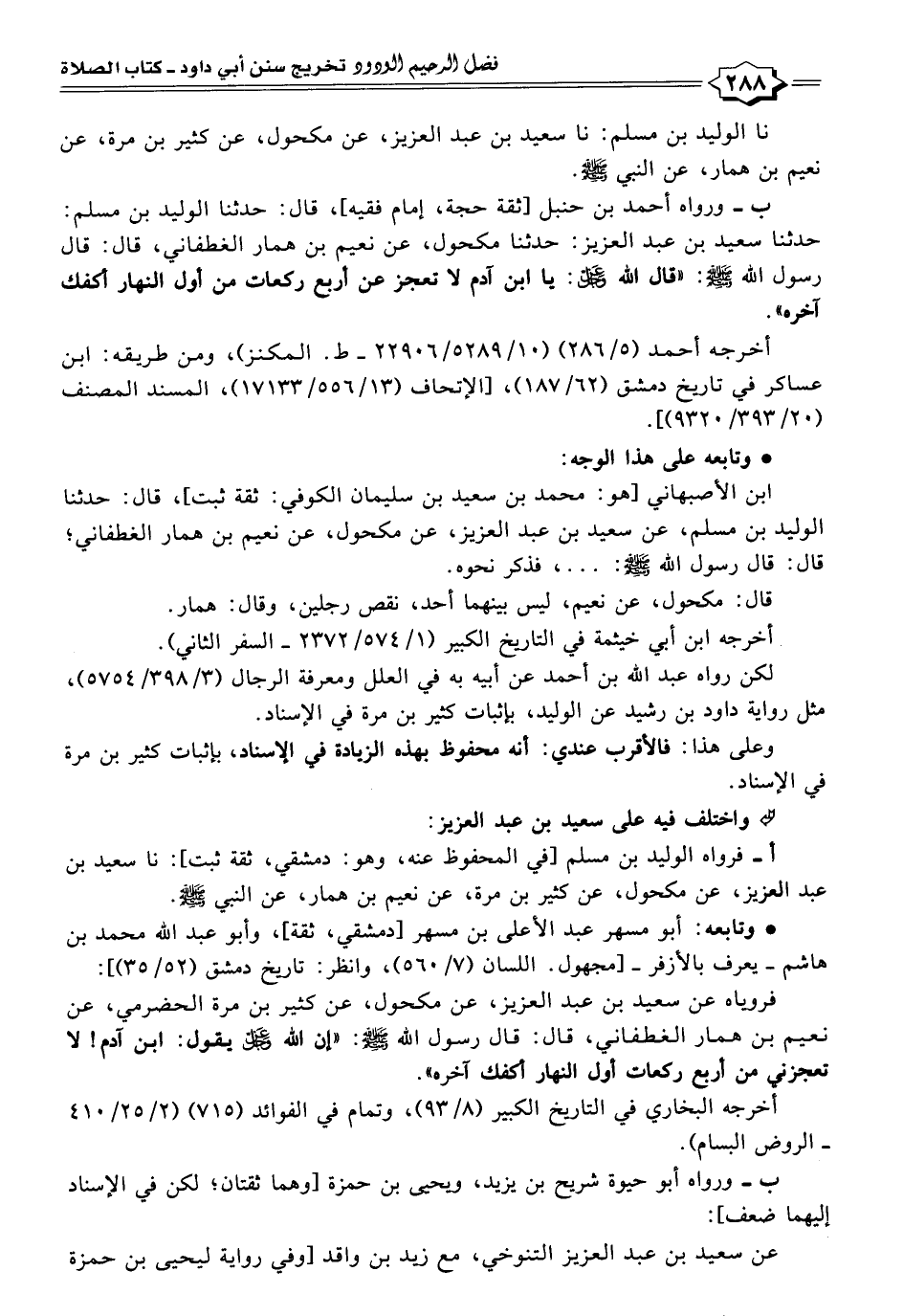 ب - ورواه أحمد بن حنبل [ثقة حجة، إمام فقيه]، قال: حدثنا الوليد بن مسلم: حدثنا سعيد بن عبد العزيز: حدثنا مكحول، عن نعيم بن همار الغطفاني، قال: قال رسول الله - صلى الله عليه وسلم -: "قال الله - عز وجل -: يا ابن آدم لا تعجز عن أربع ركعات من أول النهار أكفك آخره".