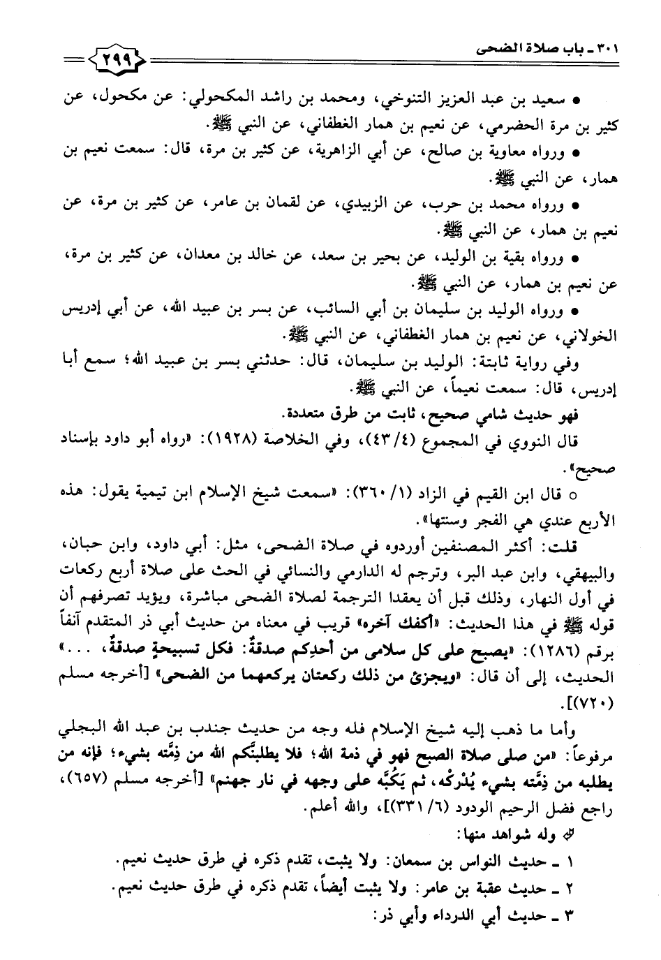 قلت: أكثر المصنفين أوردوه في صلاة الضحى، مثل: أبي داود، وابن حبان، والبيهقي، وابن عبد البر، وترجم له الدارمي والنسائي في الحث على صلاة أربع ركعات في أول النهار، وذلك قبل أن يعقدا الترجمة لصلاة الضحى مباشرة، ويؤيد تصرفهم أن قوله - صلى الله عليه وسلم - في هذا الحديث: "أكفك آخره" قريب في معناه من حديث أبي ذر المتقدم آنفًا برقم (١٢٨٦): "يصبح على كل سلامى من أحدِكم صدقةٌ: فكل تسببحةٍ صدقةٌ، ... " الحديث، إلى أن قال: "ويجزئ من ذلك ركعتان يركعهما من الضحى" [أخرجه مسلم (٧٢٠)].