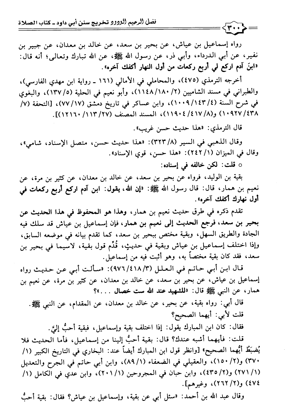 رواه إسماعيل بن عياش، عن بحير بن سعد، عن خالد بن معدان، عن جبير بن نفير، عن أبي الدرداء، وأبي ذر، عن رسول الله - صلى الله عليه وسلم -، عن الله تبارك وتعالى؛ أنه قال: "ابنَ آدم اركع لي أربع ركعات من أول النهار أكفك آخره".
