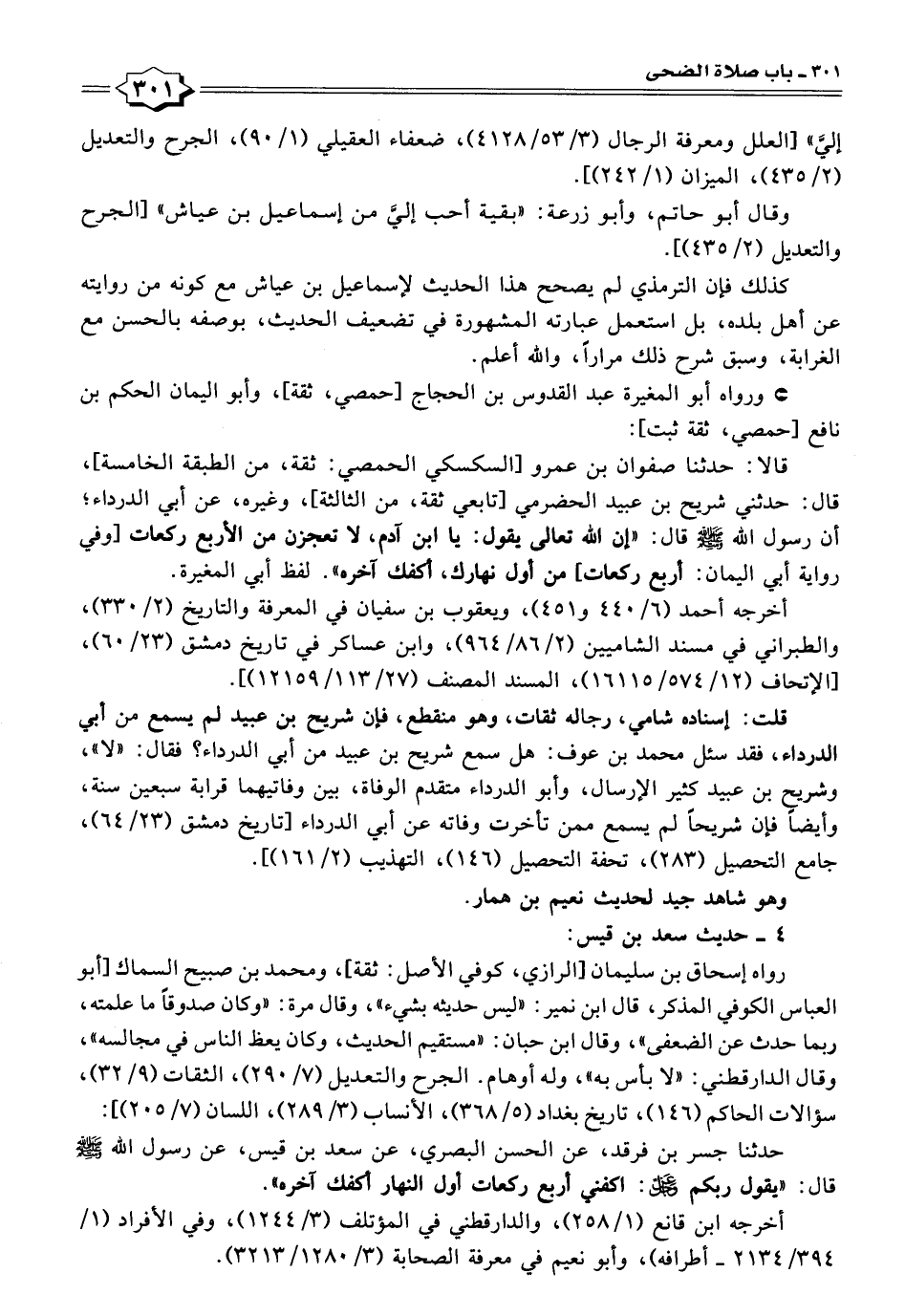 قالا: حدثنا صفوان بن عمرو [السكسكي الحمصي: ثقة، من الطبقة الخامسة]، قال: حدثني شريح بن عبيد الحضرمي [تابعي ثقة، من الثالثة]، وغيره، عن أبي الدرداء؛ أن رسول الله - صلى الله عليه وسلم - قال: "إن الله تعالى يقول: يا ابن آدم، لا تعجزن من الأربع ركعات [وفي رواية أبي اليمان: أربع ركعات] من أول نهارك، أكفك آخره". لفظ أبي المغيرة.