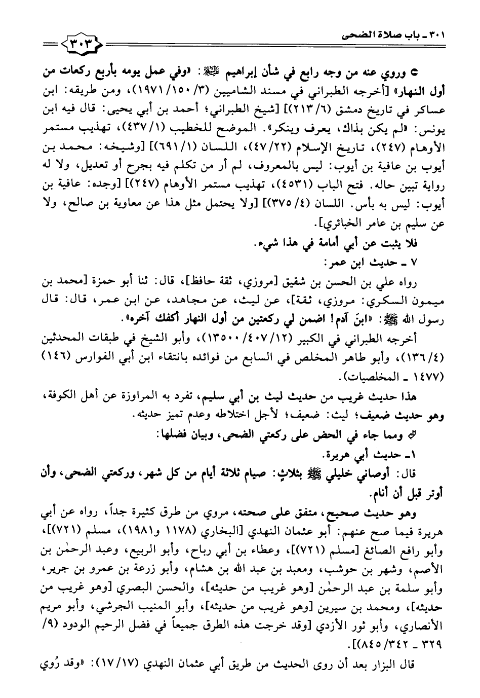وروي عنه من وجه رابع في شأن إبراهيم عليه السلام: "وفي عمل يومه بأربع ركعات من أول النهار" [أخرجه الطبراني في مسند الشاميين (٣/ ١٥٠/ ١٩٧١)، ومن طريقه: ابن عساكر في تاريخ دمشق (٦/ ٢١٣)] [شيخ الطبراني؛ أحمد بن أبي يحيى: قال فيه ابن يونس: "لم يكن بذاك، يعرف وينكر". الموضح للخطيب (١/ ٤٣٧)، تهذيب مستمر الأوهام (٢٤٧)، تاريخ الإسلام (٢٢/ ٤٧)، اللسان (١/ ٦٩١)] [وشيخه: محمد بن أيوب بن عافية بن أيوب: ليس بالمعروف، لم أر من تكلم فيه بجرح أو تعديل، ولا له رواية تبين حاله. فتح الباب (٤٥٣١)، تهذيب مستمر الأوهام (٢٤٧)] [وجده: عافية بن أيوب: ليس به بأس. اللسان (٤/ ٣٧٥)] [ولا يحتمل مثل هذا عن معاوية بن صالح، ولا عن سليم بن عامر الخبائري].