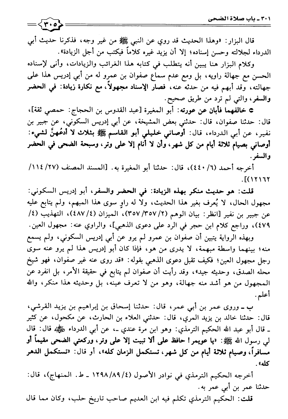 ب - وروى عمر بن أبي عمر، قال: حدثنا إسحاق بن إبراهيم بن يزيد القرشي، قال: حدثنا خالد بن يزيد المري، قال: حدثني العلاء بن الحارث، عن مكحول، عن كثير - قال أبو عبد الله الحكيم الترمذي: وهو ابن مرة عندي -، عن أبي الدرداء - رضي الله عنه - قال: قال لي رسول الله - صلى الله عليه وسلم -: "يا عويمر! حافظ على ألا تبيت إلا على وتر، وركعتي الضحى مقيمًا أو مسافرًا، وصيام ثلاثة أيام من كل شهر، تستكمل الزمان كله"، أو قال: "تستكمل الدهر كله".