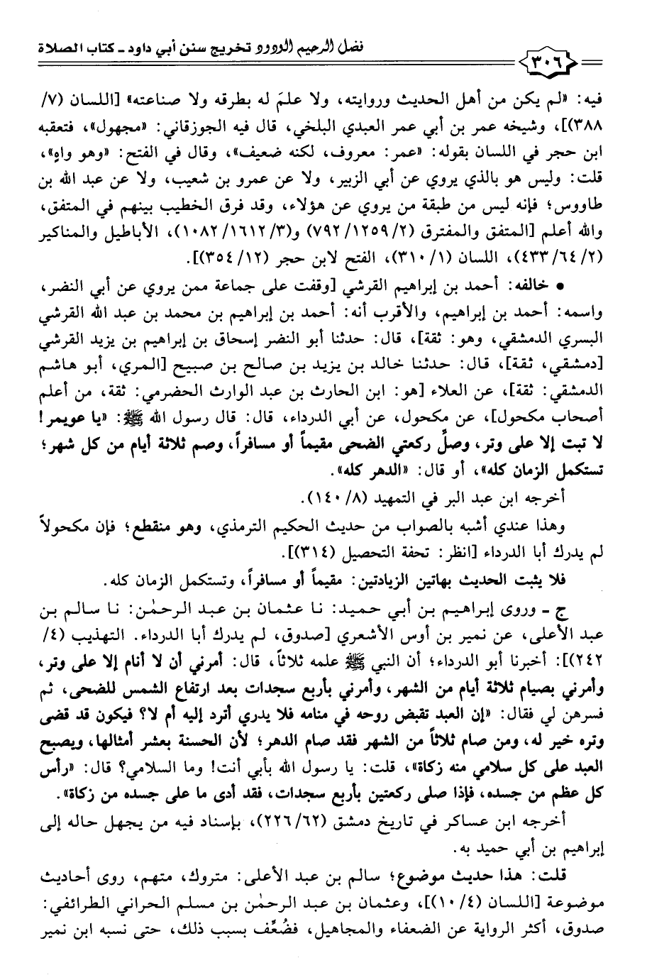 ج - وروى إبراهيم بن أبي حميد: نا عثمان بن عبد الرحمن: نا سالم بن عبد الأعلى، عن نمير بن أوس الأشعري [صدوق، لم يدرك أبا الدرداء. التهذيب (٤/ ٢٤٢)]: أخبرنا أبو الدرداء؛ أن النبي - صلى الله عليه وسلم - علمه ثلاثًا، قال: أمرني أن لا أنام إلا على وتر، وأمرني بصيام ثلاثة أيام من الشهر، وأمرني بأربع سجدات بعد ارتفاع الشمس للضحى، ثم فسرهن لي فقال: "إن العبد تقبض روحه في منامه فلا يدري أترد إليه أم لا؟ فيكون قد قضى وتره خير له، ومن صام ثلاثًا من الشهر فقد صام الدهر؛ لأن الحسنة بعشر أمثالها، ويصبح العبد على كل سلامي منه زكاة"، قلت: يا رسول الله بأبي أنت! وما السلامي؟ قال: "رأس كل عظم من جسده، فإذا صلى ركعتين بأربع سجدات، فقد أدى ما على جسده من زكاة".