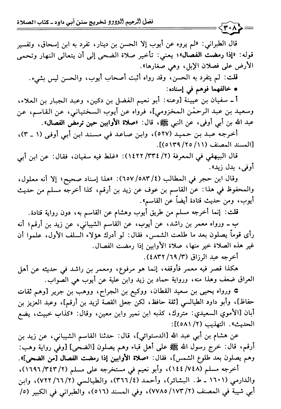 ب - ورواه معمر بن راشد، عن أيوب، عن القاسم الشيباني، عن زيد بن أرقم؛ أنه رأى قومًا يصلون بعد ما طلعت الشمس، فقال: لو أدرك هؤلاء السلف الأول، علموا أن غير هذه الصلاة خير منها، صلاة الأوابين إذا رمضت الفصال.