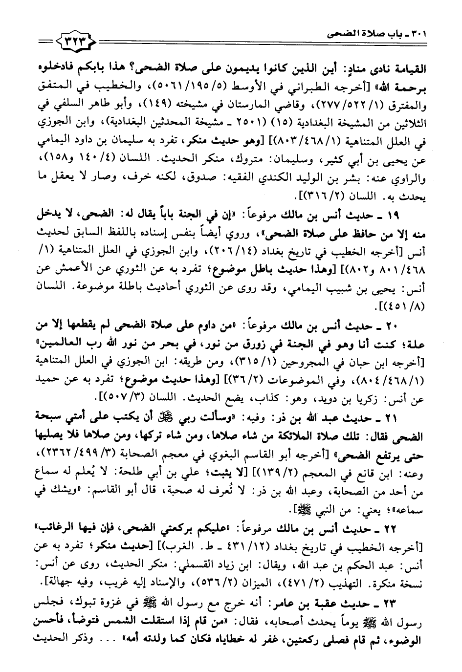 ٢١ - حديث عبد الله بن ذر: وفيه: "وسألت ربي عز وجل أن يكتب على أمتي سبحة الضحى فقال: تلك صلاة الملائكة من شاء صلاها، ومن شاء تركها، ومن صلاها فلا يصليها حتى يرتفع الضحى" [أخرجه أبو القاسم البغوي في معجم الصحابة (٣/ ٤٩٩/ ٢٣٦٢)، وعنه: ابن قانع في المعجم (٢/ ١٣٩)] [لا يثبت؛ علي بن أبي طلحة: لا يُعلم له سماع من أحد من الصحابة، وعبد الله بن ذر: لا تُعرف له صحبة، قال أبو القاسم: "ويشك في سماعه"؛ يعني: من النبي - صلى الله عليه وسلم -].