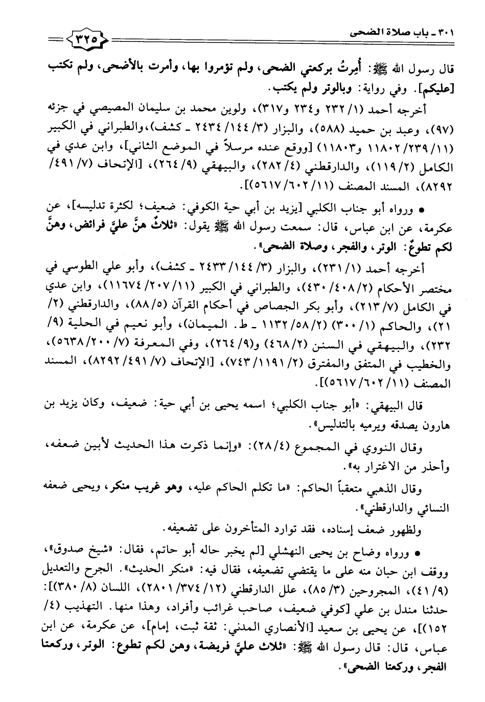 • ورواه أبو جناب الكلبي [يزيد بن أبي حية الكوفي: ضعيف؛ لكثرة تدليسه]، عن عكرمة، عن ابن عباس، قال: سمعت رسول الله - صلى الله عليه وسلم - يقول: "ثلاثٌ هنَّ عليَّ فرائض، وهنَّ لكم تطوعٌ: الوتر، والفجر، وصلاة الضحى".