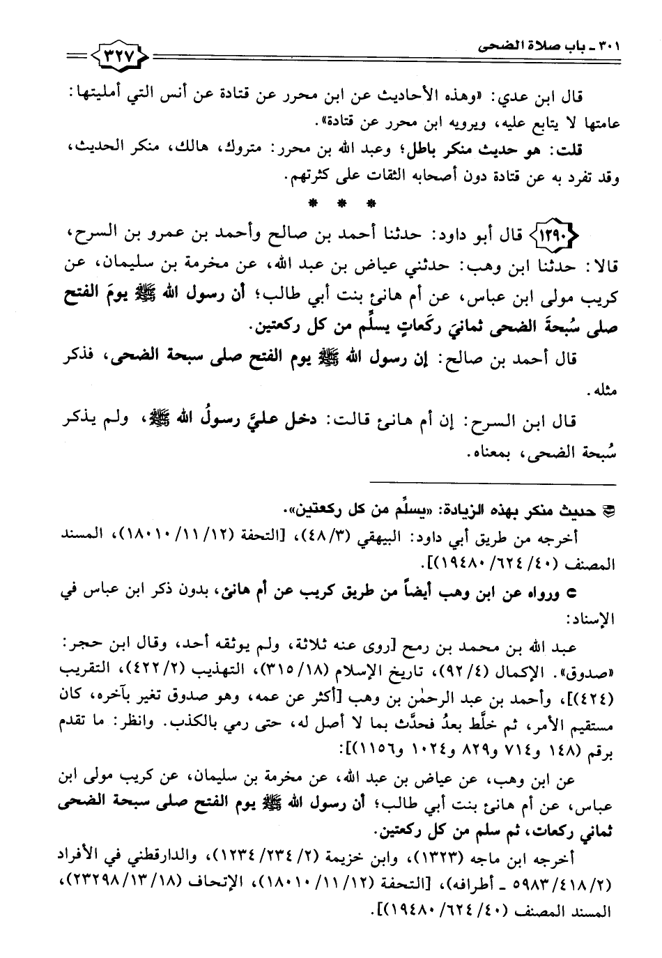 عن ابن وهب، عن عياض بن عبد الله، عن مخرمة بن سليمان، عن غريب مولى ابن عباس، عن أم هانئ بنت أبي طالب؛ أن رسول الله - صلى الله عليه وسلم - يوم الفتح صلى سبحة الضحى ثماني ركعات، ثم سلم من كل ركعتين.