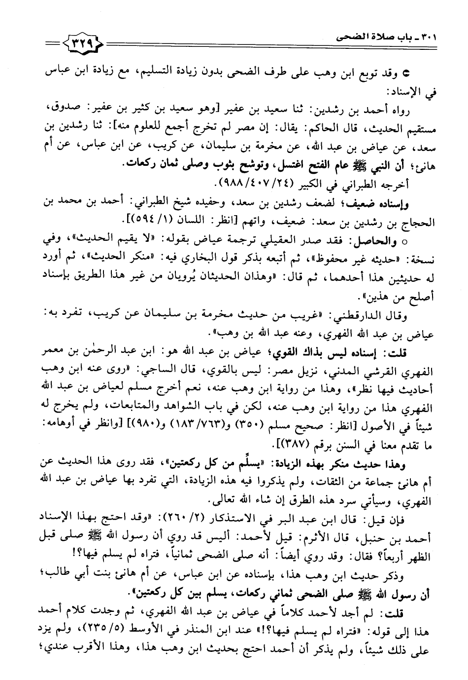 وهذا حديث منكر بهذه الزبادة: "يسلِّم من كل ركعتين"، فقد روى هذا الحديث عن أم هانئ جماعة من الثقات، ولم يذكروا فيه هذه الزيادة، التي تفرد بها عياض بن عبد الله الفهري، وسيأتي سرد هذه الطرق إن شاء الله تعالى.