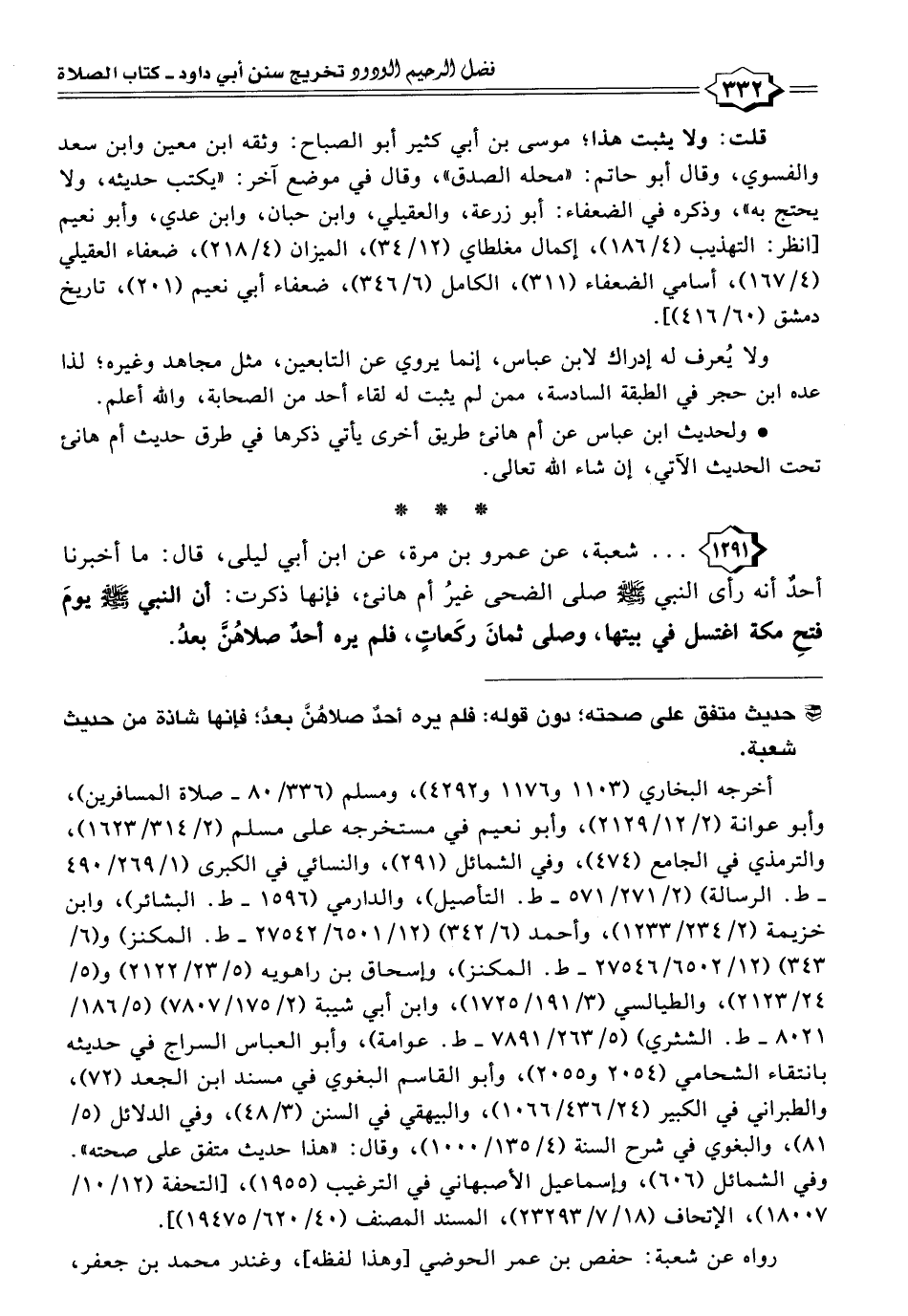 ١٢٩١ - . . . شعبة، عن عمرو بن مرة، عن ابن أبي ليلى، قال: ما أخبرنا أحدٌ أنه رأى النبي - صلى الله عليه وسلم - صلى الضحى غيرُ أم هانئ فإنها ذكرت: أن النبي - صلى الله عليه وسلم - يومَ فتحِ مكة اغتسل في بيتها، وصلى ثمانَ ركَعاتٍ، فلم يره أحدٌ صلاهُنَّ بعدُ.