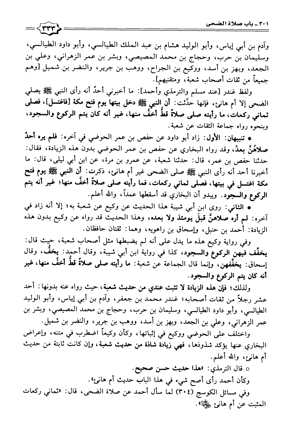 ولفظ غندر [عند مسلم والترمذي وأحمد]: ما أخبرني أحدٌ أنه رأى النبي - صلى الله عليه وسلم - يصلي الضحى إلا أم هانئ، فإنها حدَّثت: أن النبي - صلى الله عليه وسلم - دخل بيتها يوم فتح مكة [فاغتسل]، فصلى ثماني ركعات، ما رأيته صلى صلاةً قطُّ أخفَّ منها، غير أنه كان يتم الركوع والسجود، وبنحوه رواه جماعة الثقات عن شعبة.