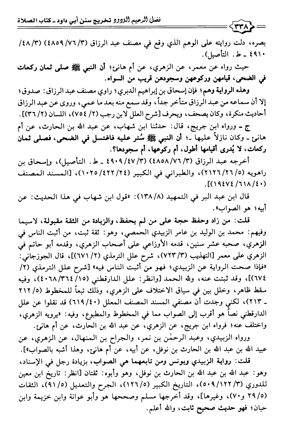 حيث رواه عن معمر، عن الزهري، عن أم هانئ؛ أن النبي - صلى الله عليه وسلم - صلى ثمان ركعات في الضحى، قيامهن وركوعهن وسجودهن قريب من السواء.